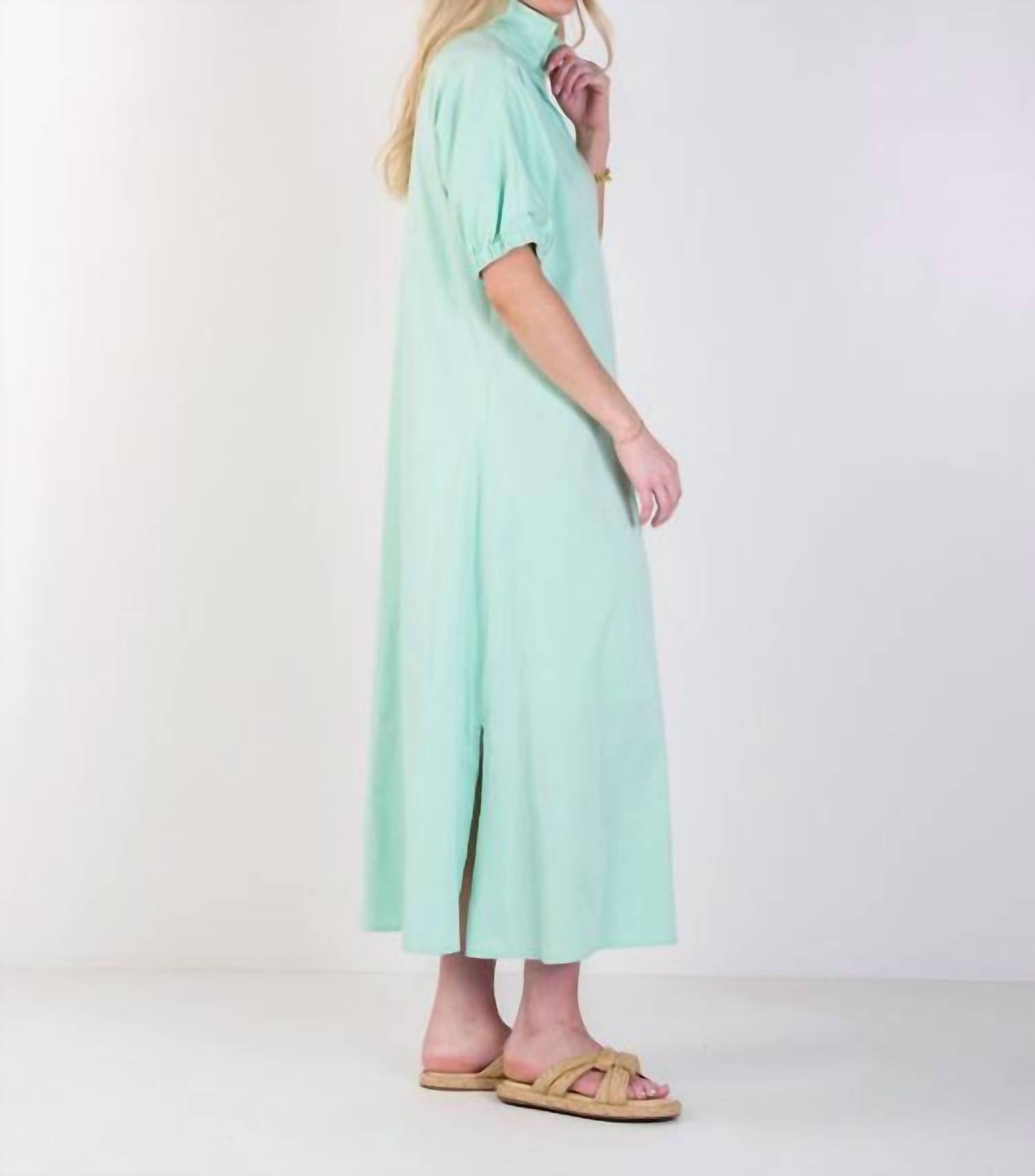 Who doesn't love a good maxi dress? This one you'll be reaching for season after season. The Poppy Maxi Dress by Emily McCarthy is your essential vacation piece, providing both style and comfort in Mist Green. Featuring elbow-length loose elastic dolman sleeves, this relaxed A-line silhouette is made from a crisp cotton blend for a touch of ease. Composition: 98% Cotton, 2% Spandex with a 100% Polyester lining. Closure: Pull on. Care: Machine wash on delicate cycle with cold water and gentle detergent; line dry to maintain color and shape. Ideal for those minimalist spring outings, this solid-color dress keeps you effortlessly polished.