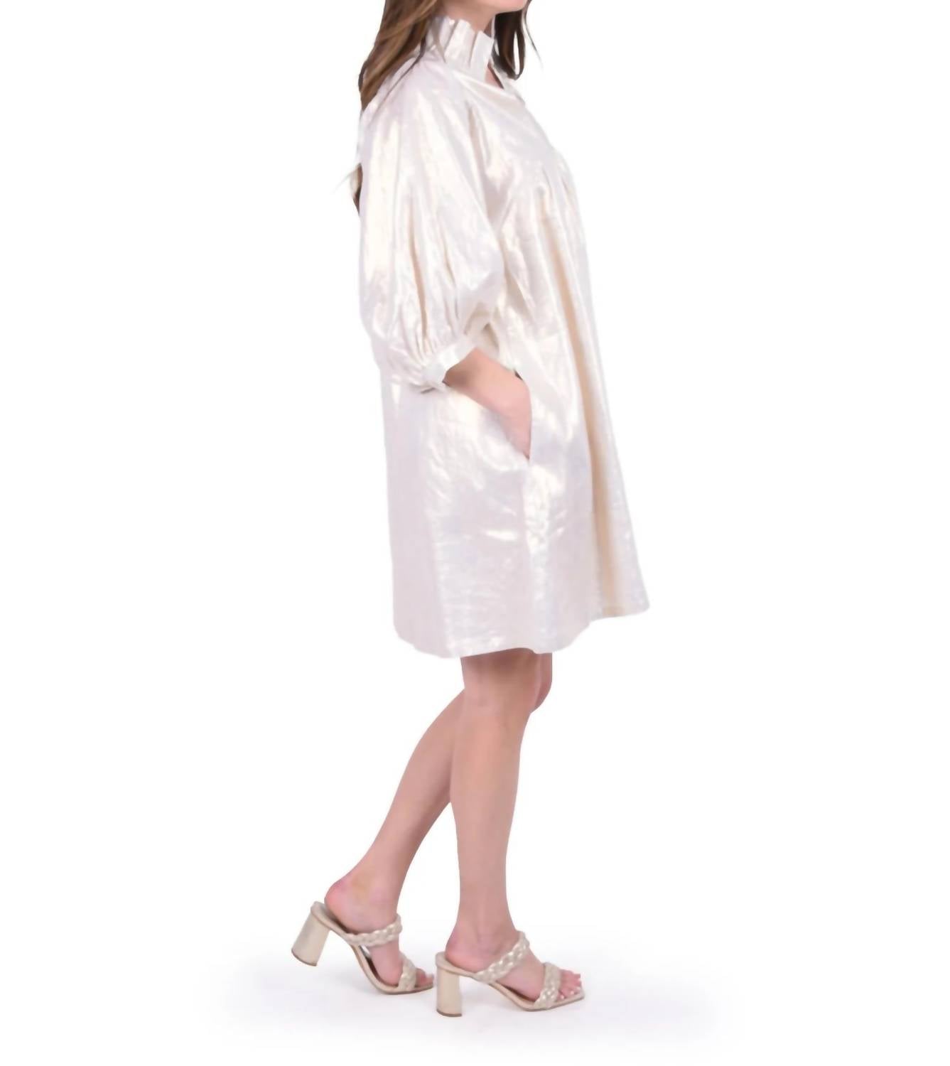 The kind of easy and flattering dress you'll be reaching for all season long. Introducing the Stella Dress by Emily McCarthy, a stunning mini-length piece in an eye-catching white gold shade. This dress features three-quarter blouson sleeves and a ruffle stand-up collar with a stylish notched neckline. The garment is crafted from 100% polyester, offering a relaxed empire shape with a forgiving fit and convenient side slit pockets. Perfect for elevating your wardrobe, this piece is designed with comfort and style in mind.