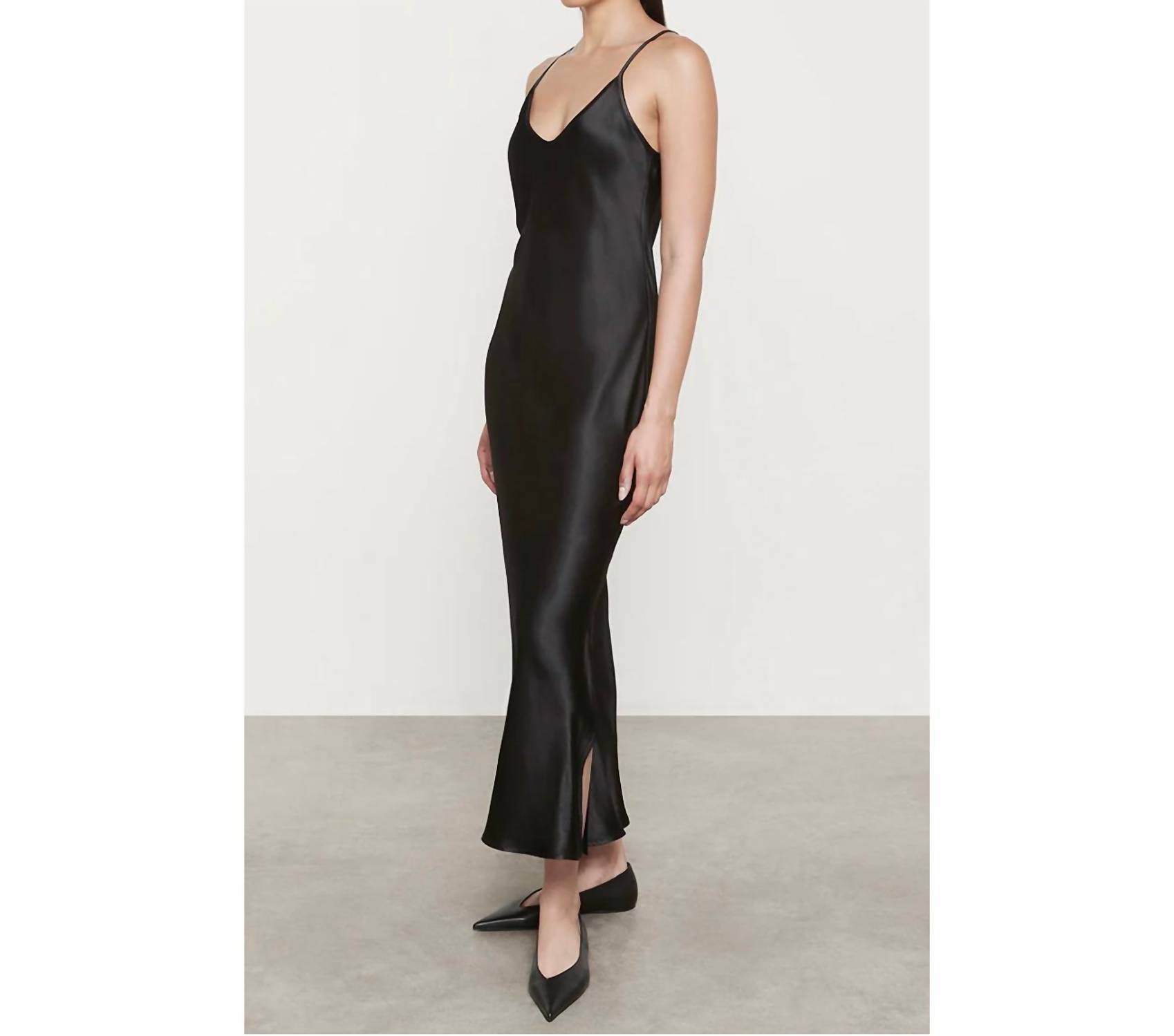 Discover the Bias Cut Slip Dress by Enza Costa, a sophisticated choice for your wardrobe. This solid black maxi dress is made from luxurious 100% Rayon with spaghetti straps and a graceful V-neckline. Its fluid satin material drapes beautifully down to an ankle-skimming hem, featuring a chic side slit. Made in the USA with a convenient pull-on closure.
