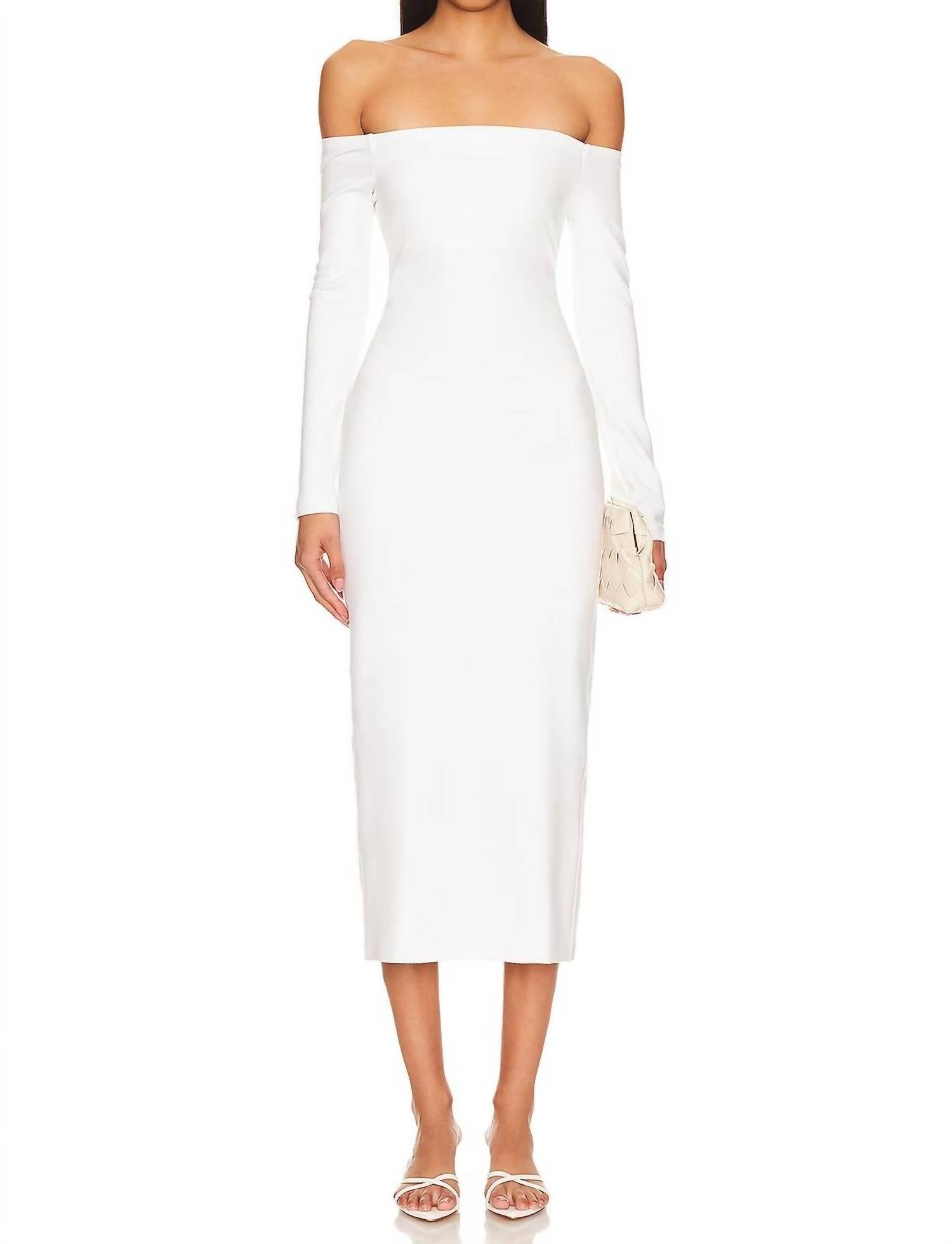 Style this maxi with your favorite statement necklace and sandals for the perfect look. A fitted long-sleeved dress in compact knitted viscose with off-the-shoulder neckline and mid-calf length.