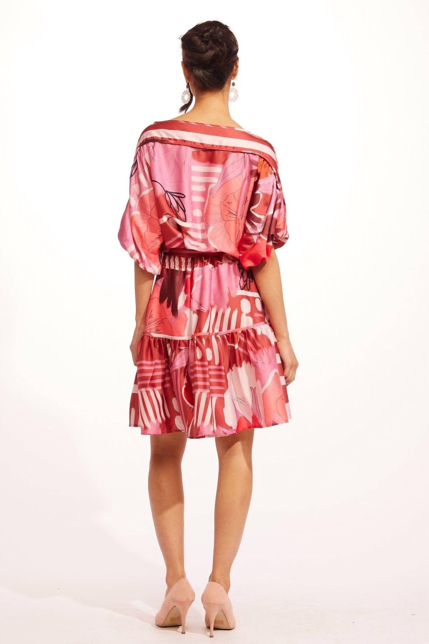 The perfect mini dress for those warmer months. Elevate your summer wardrobe with the Andrea Mini Dress by EVA FRANCO, a piece designed to captivate with its vibrant Tulipa hue and abstract floral print. This A-line dress features elbow-length sleeves, a flattering boatneck, and a waist tie for added definition. Crafted in the USA from 100% Polyester with a matching lining, it offers a lightweight and breezy fit with a convenient pull-on closure. Care: Dry clean only.