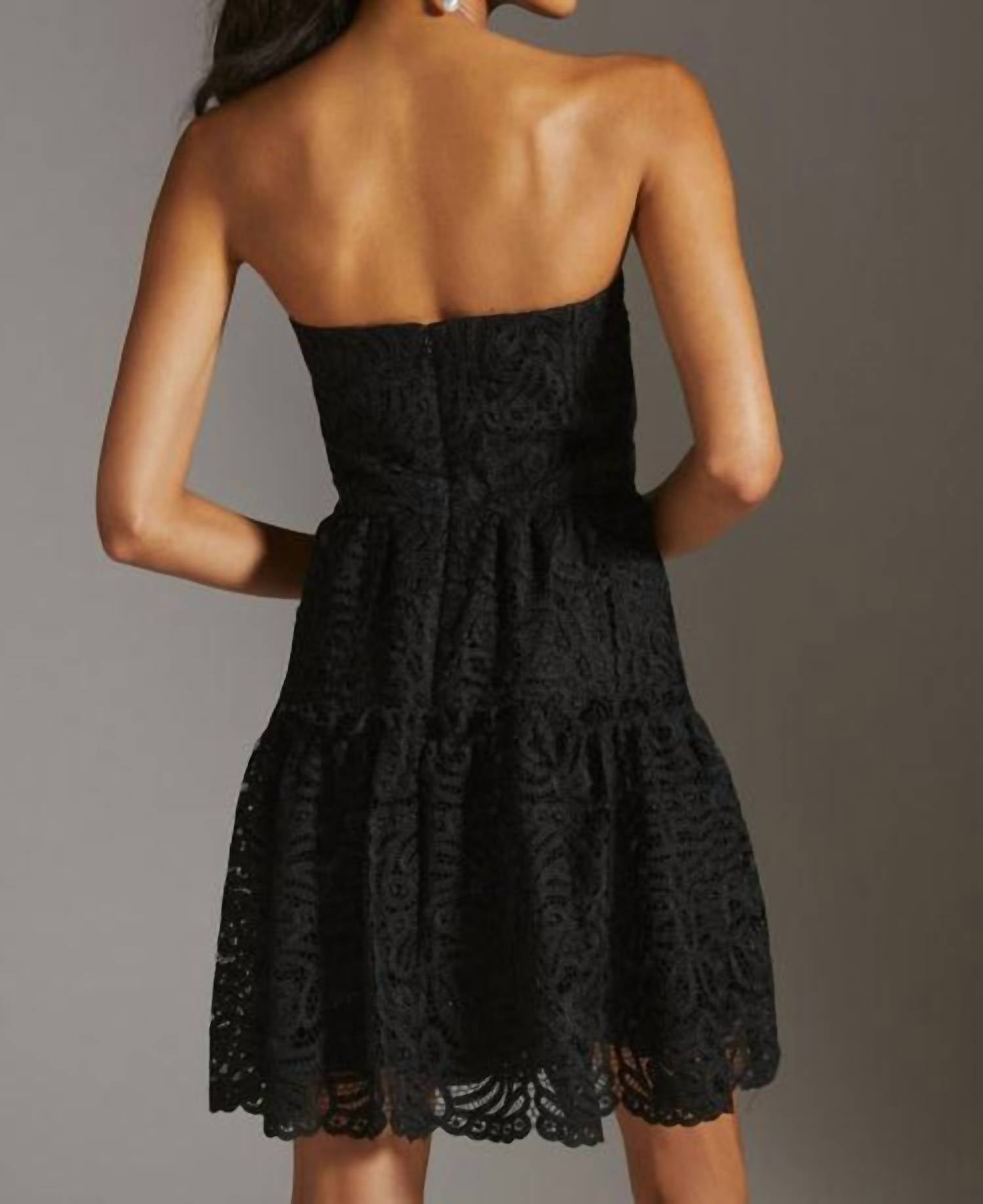 Unveil elegance with the Floral Lace Mini Dress by Eva Franco, designed to turn heads. This strapless, off-the-shoulder piece features a corset-style top and an A-line silhouette that beautifully enhances your curves. Crafted from polyester with a polyester-spandex lining, it offers comfort and a luxurious feel. Closure: Zip. Care: Hand wash. Perfect for a sophisticated night out, the black floral lace detail ensures you stand out in style.