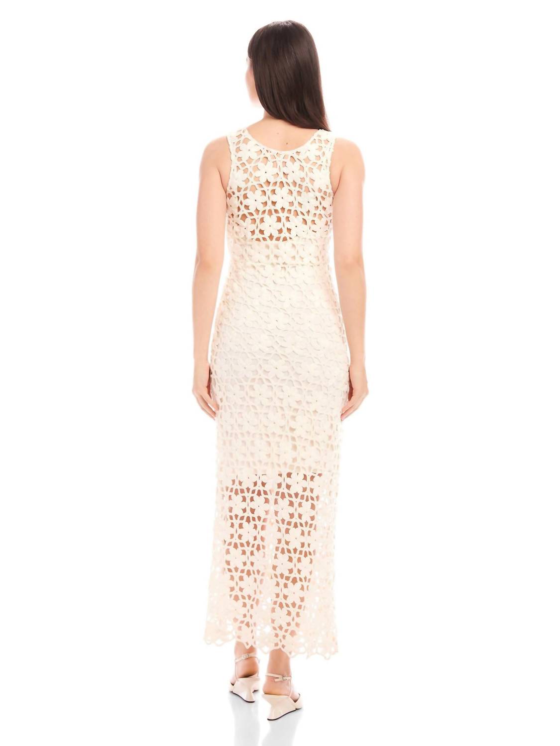 A maxi dress that is just as cute as it is comfortable. Experience timeless elegance with the Kelsie Crochet Dress by Fifteen Twenty in a charming ivory hue. This sleeveless maxi dress features a delicate floral crochet design crafted from 100% recycled polyester, complete with a scoop neckline and a side zipper closure for a seamless fit. Imported from China, it includes a detachable slip for added versatility. Care for it with a hand wash and lay flat to dry, ensuring it remains a staple for holiday parties and special occasions. Length: 49.5 inches.