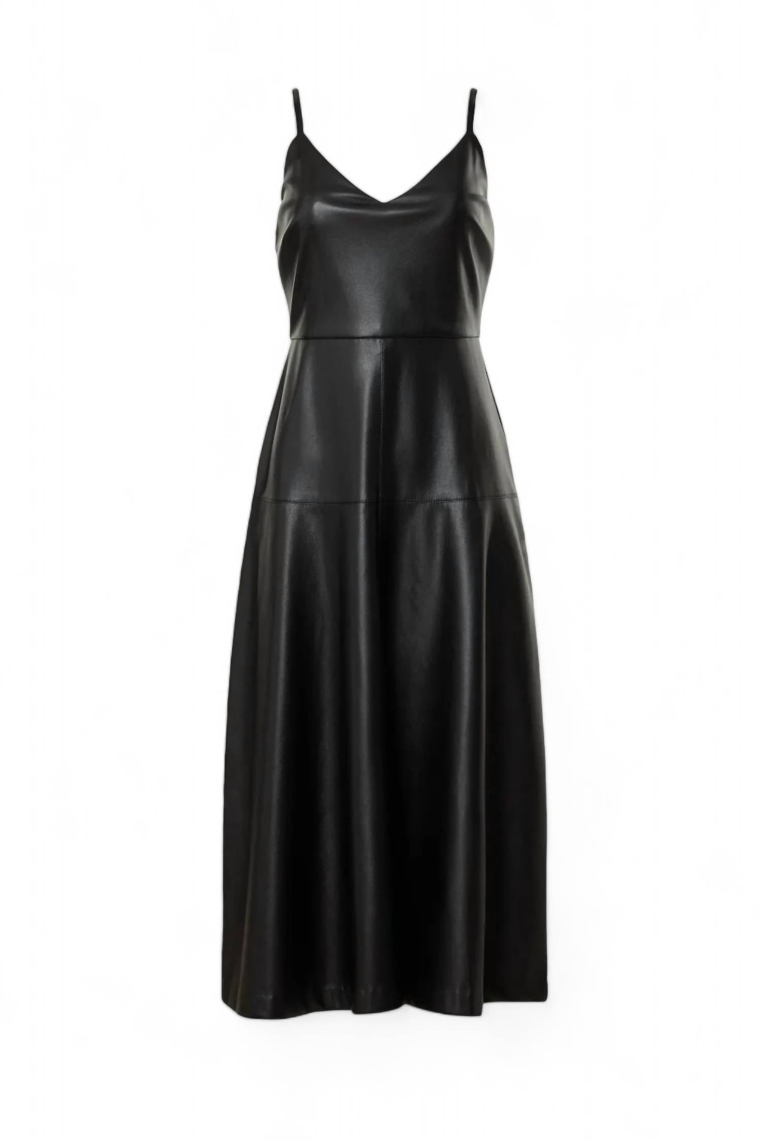 Just add slides or mules and you are good to go.This sleeveless A-line dress features a V-neck and a back zipper closure. Made from faux leather (100% Polyurethane), it measures 48 inches from shoulder to hemline. The model is 5'10.5" and is wearing a size Small. Made in the USA.