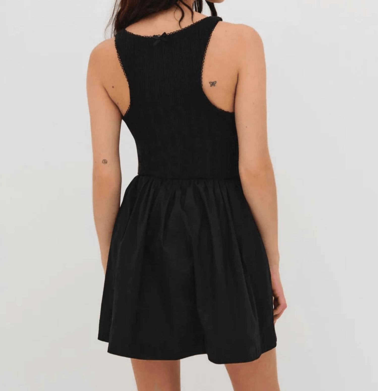 The Billie Mini Dress by For Love & Lemons is your go-to little black dress for any evening event. With a sleeveless design and fit-and-flare silhouette, this dress boasts a knit pointelle bodice and contrasting poplin mini skirt. Made from polyester, it features a pull-on closure and is detailed with picot trims and a center-front bow. To maintain its elegance, the dress should be dry cleaned.