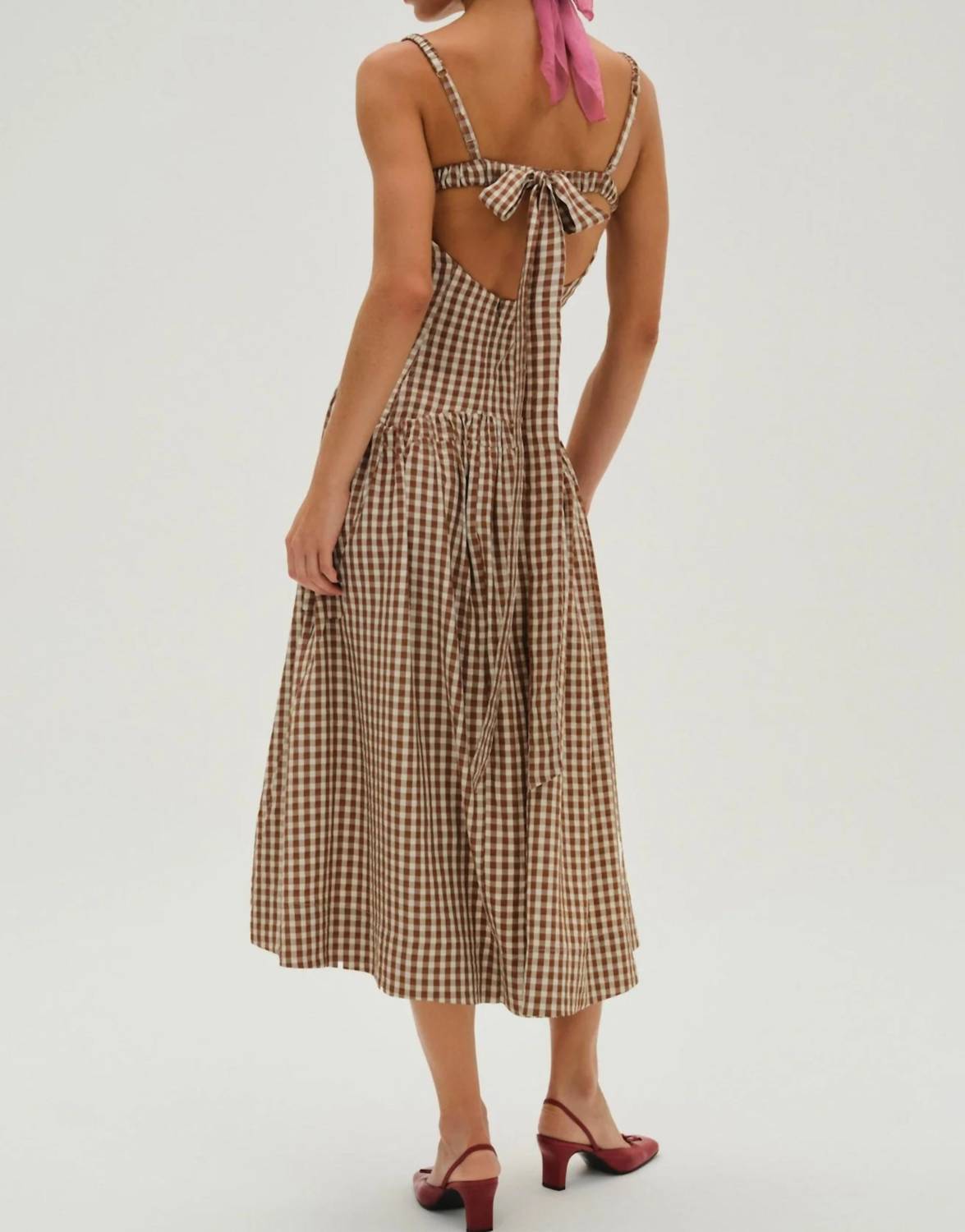 Just add slides or mules and you are good to go. The Gingerbread Gingham Midi Dress by For Love & Lemons is a charming piece to enhance any wardrobe with its timeless style. Featuring spaghetti straps and a sweetheart neckline, this dress is crafted from a viscose blend and showcases an A-line silhouette. Its elegant gingham pattern and pull-on closure offer ease and sophistication, all made in China. Care for this vintage-inspired piece with dry cleaning to maintain its beauty through the seasons.