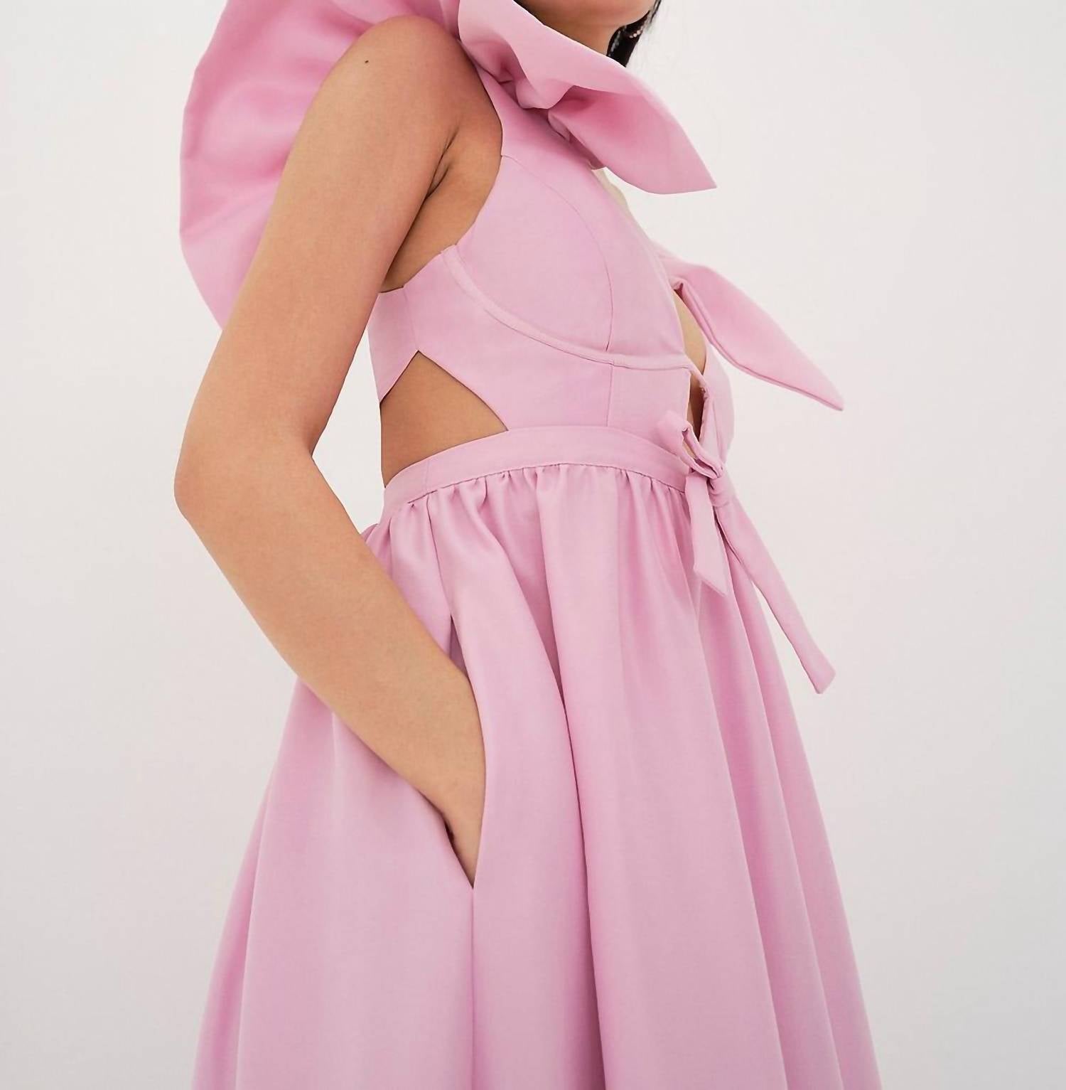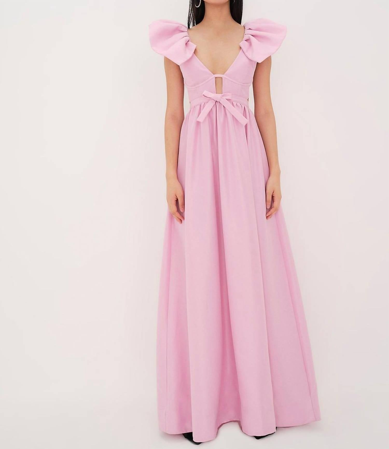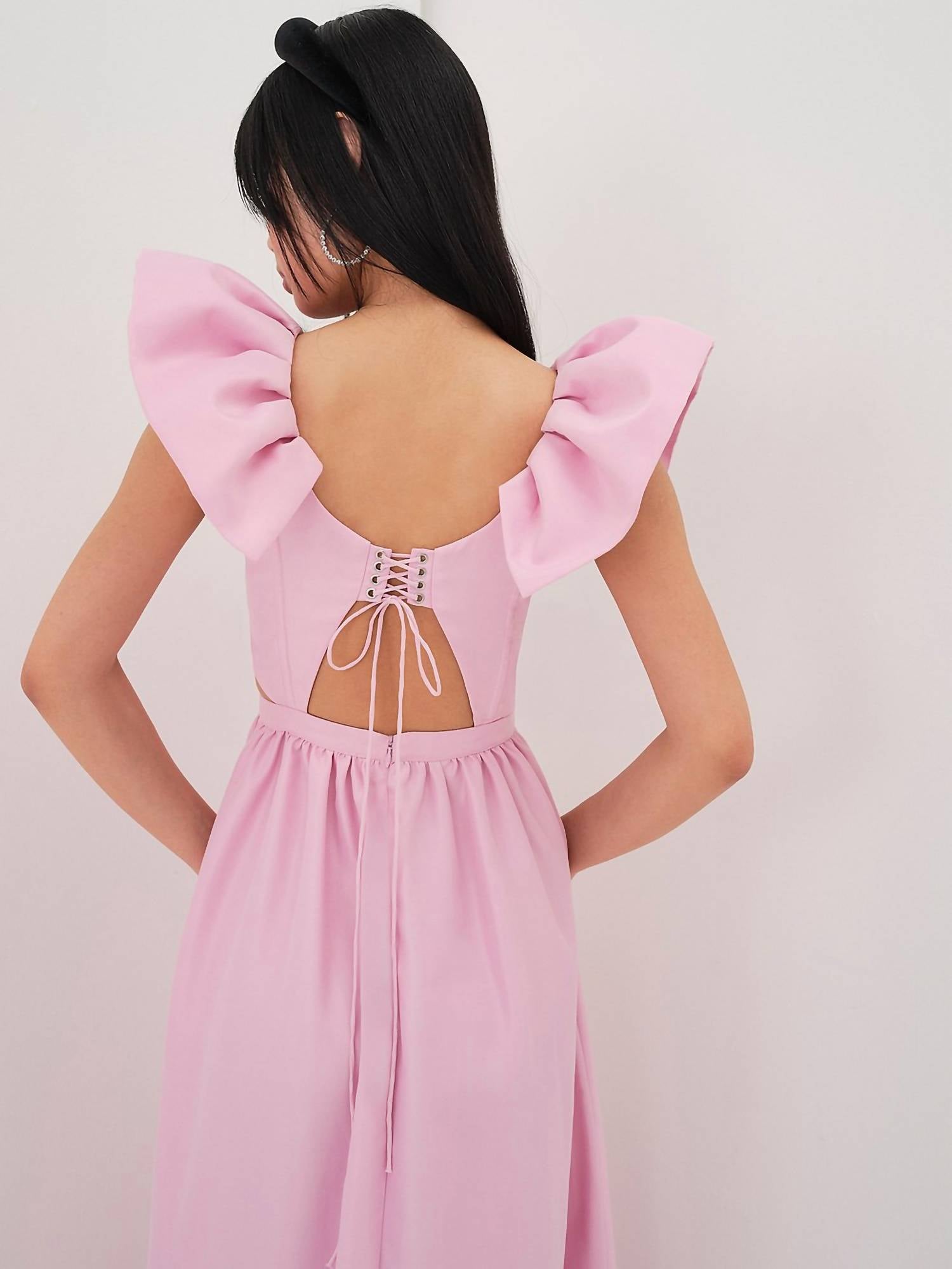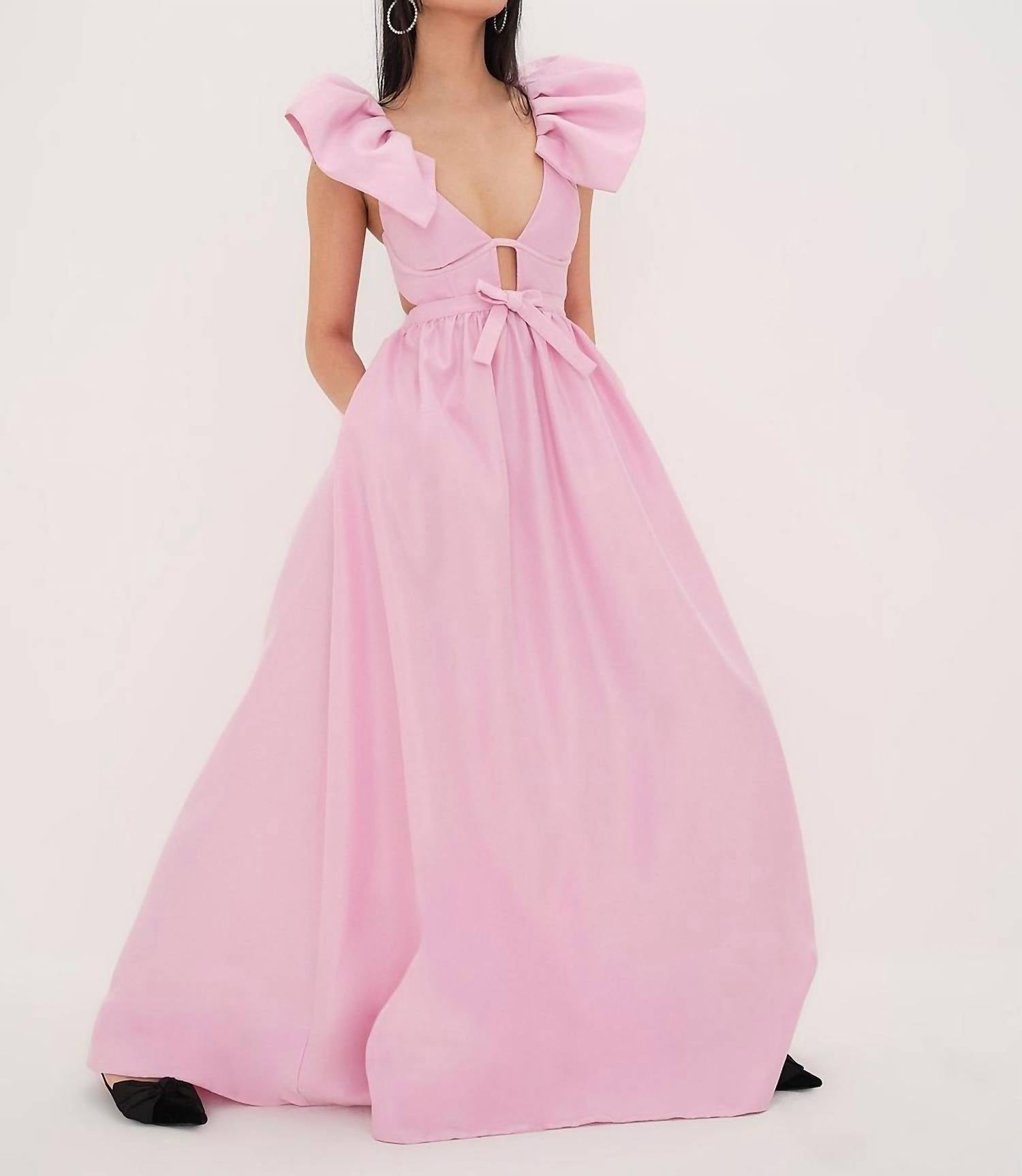 Style this maxi with your favorite statement necklace and sandals for the perfect look. Introducing the Miriam Ballerina Dress by For Love & Lemons, a stunning choice for prom in a delightful pink hue. This fit-and-flare maxi dress features ruffle cap sleeves and a charming corset back with a tie closure. Made from 100% polyester, its solid color and scoop neckline offer a classic look perfect for spring events. Please follow any care instructions provided to ensure longevity.