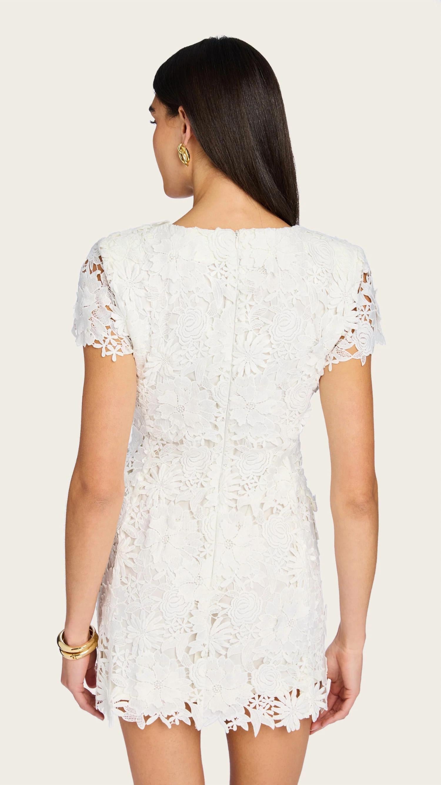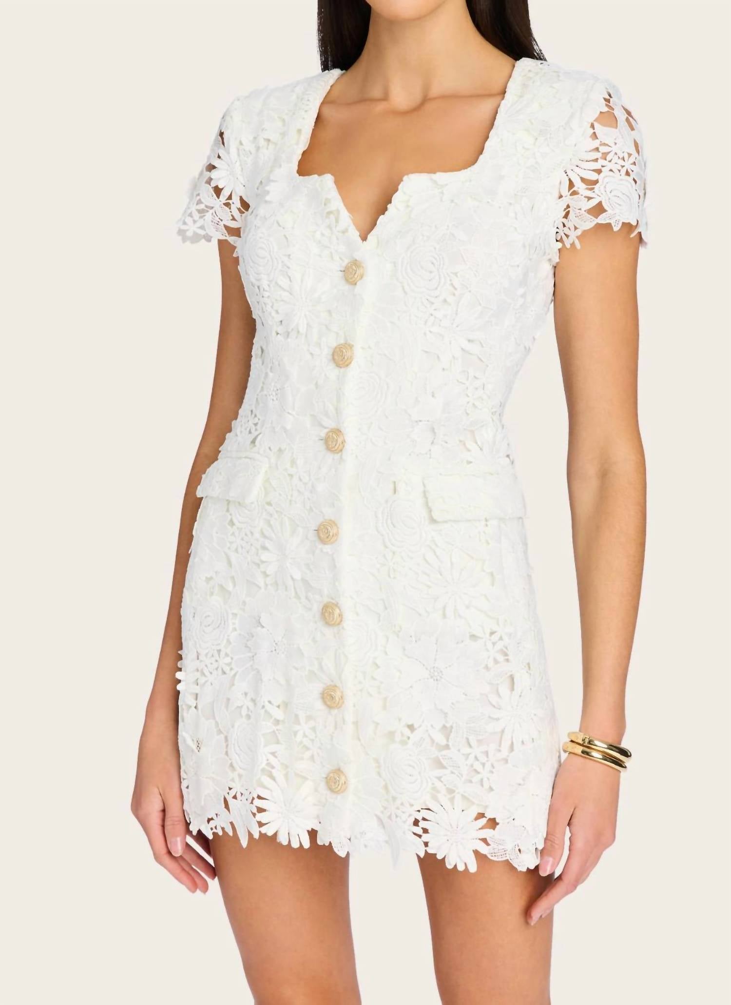 The kind of easy and flattering dress you'll be reaching for all season long. Introducing the Brunella Lace Dress by Generation Love, a chic mini dress perfect for weddings and summer occasions. This dress features short sleeves and a striking floral guipure lace pattern in textured white, with a modern V-notch neckline to enhance its polished look. Made from 100% polyester with a lining blend of 97% polyester and 3% elastane, the bodycon silhouette closes with elegant laurel wreath shield shank buttons, and has a length of 33". For best care, this garment requires professional dry cleaning. Model wears a US 2/XS (5'10" height).