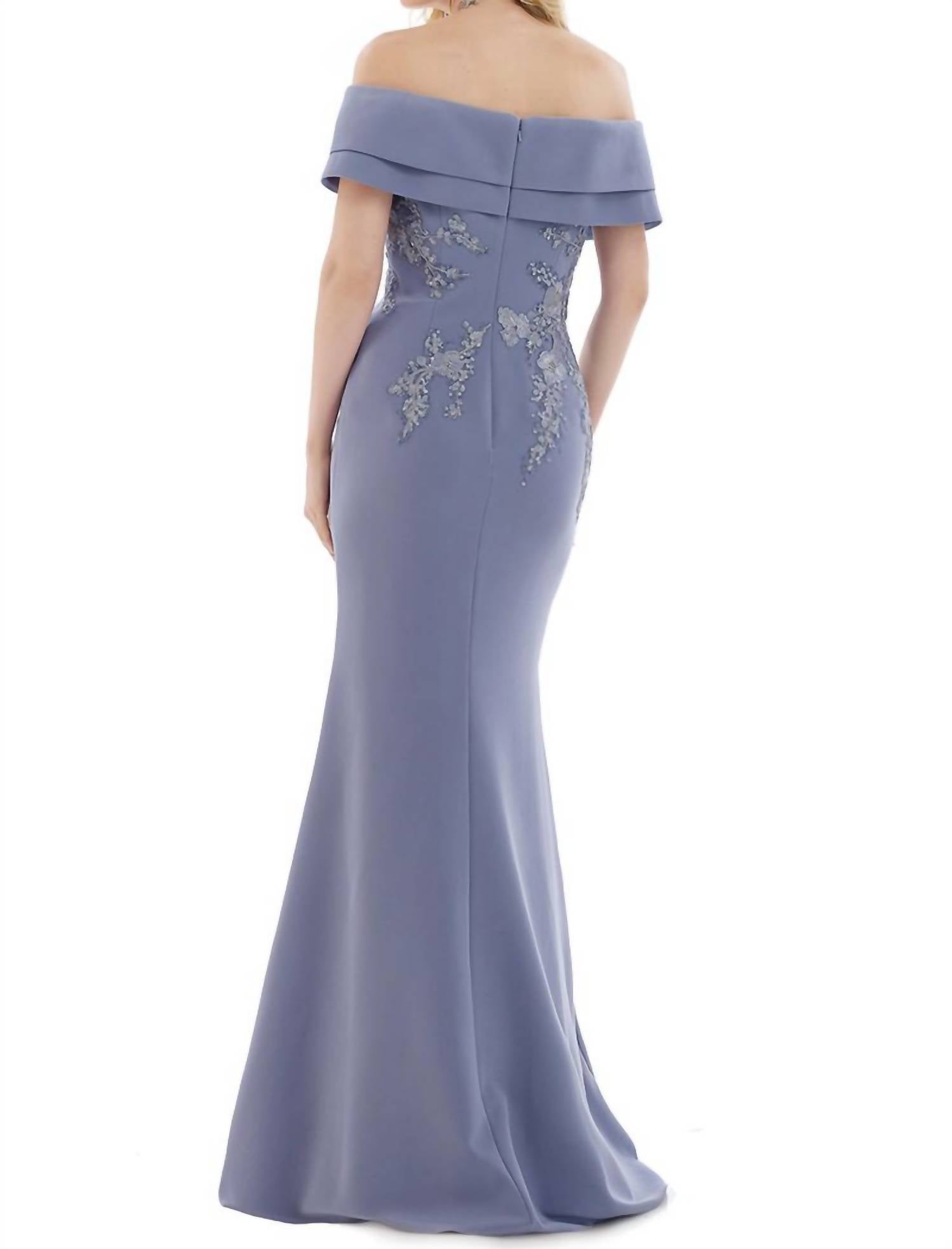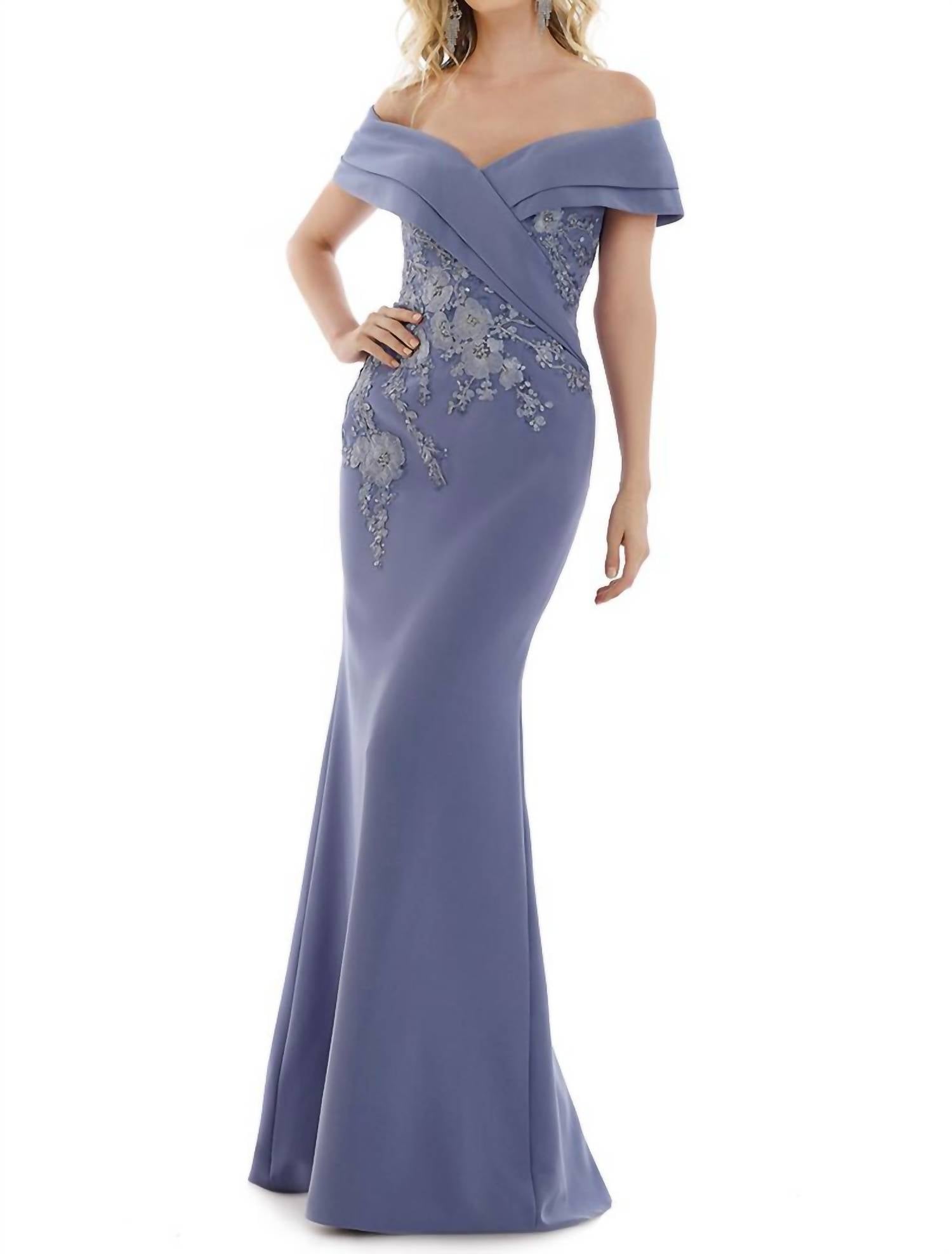 Just add a cute little clutch and a matching heel for the perfect event look. Experience elegance with the Gia Franco Floral Off Shoulder Dress in Venice Blue, crafted for your next prom. This stunning piece features short sleeves and an off-the-shoulder neckline, adorned with pleating and floral designs. Highlighted by a mermaid silhouette, the dress cascades to a full-length hemline with a convenient zip closure at the mid-open back. Pattern: Floral.