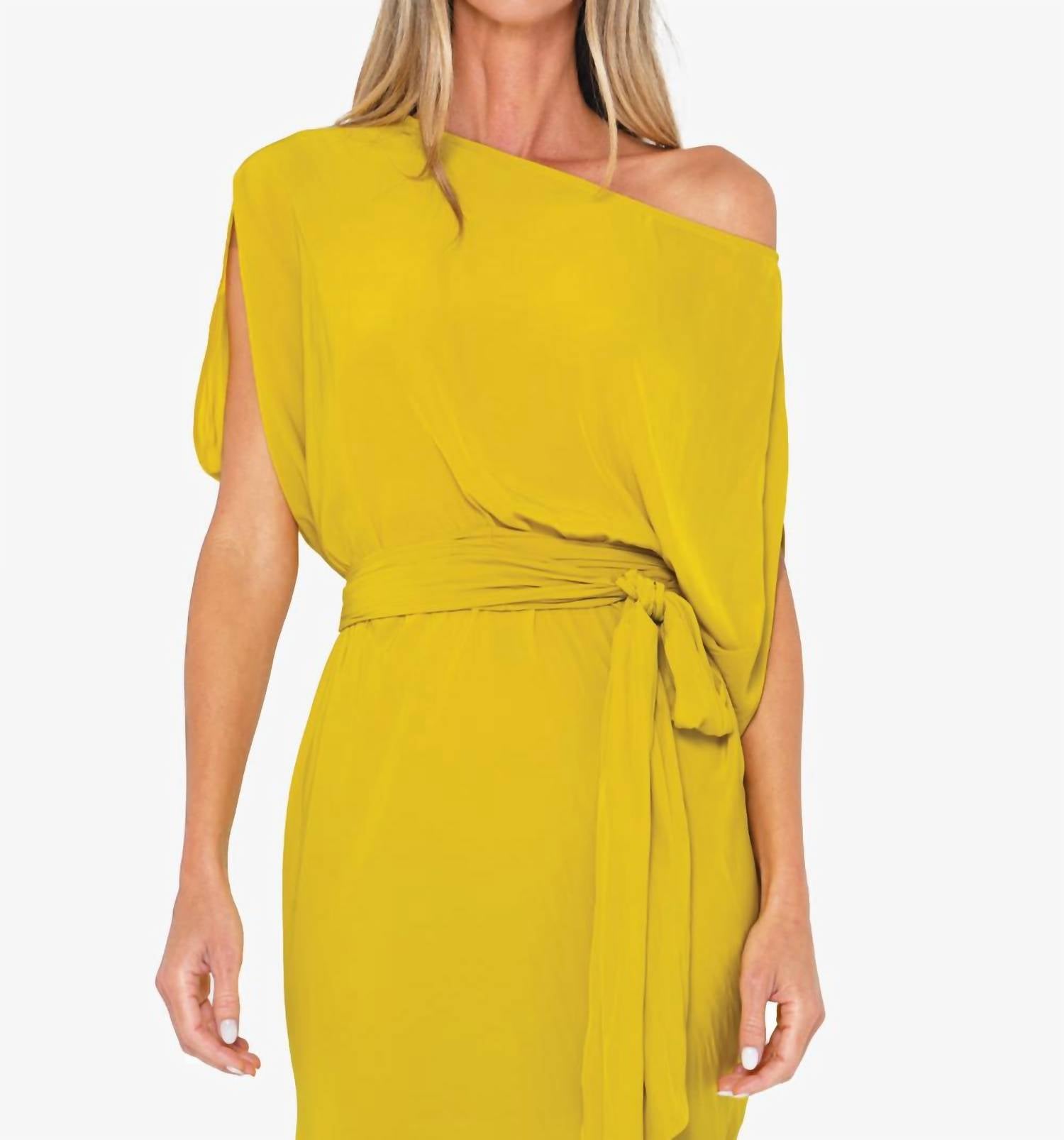 Introducing the Mariah Midi Dress by JBQ, a stunning choice for any evening event in a vibrant citron hue. This sleeveless dress boasts a solid, off-the-shoulder wrap silhouette with an asymmetrical midi hem and an optional sash for added elegance. It is crafted from 100% polyester and features a pullover closure for ease. Proudly made in the USA from imported materials, this minimalist piece requires dry cleaning to maintain its pristine condition. The model is 5'9" and wearing a size small.