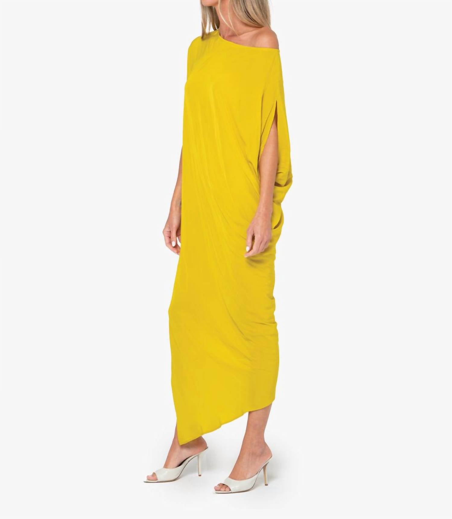 Cute and comfortable, this long sleeve dress has it all. Introducing the Mariah Midi Dress by JBQ, a stunning choice for any evening event in a vibrant citron hue. This sleeveless dress boasts a solid, off-the-shoulder wrap silhouette with an asymmetrical midi hem and an optional sash for added elegance. It is crafted from 100% polyester and features a pullover closure for ease. Proudly made in the USA from imported materials, this minimalist piece requires dry cleaning to maintain its pristine condition. The model is 5'9" and wearing a size small.