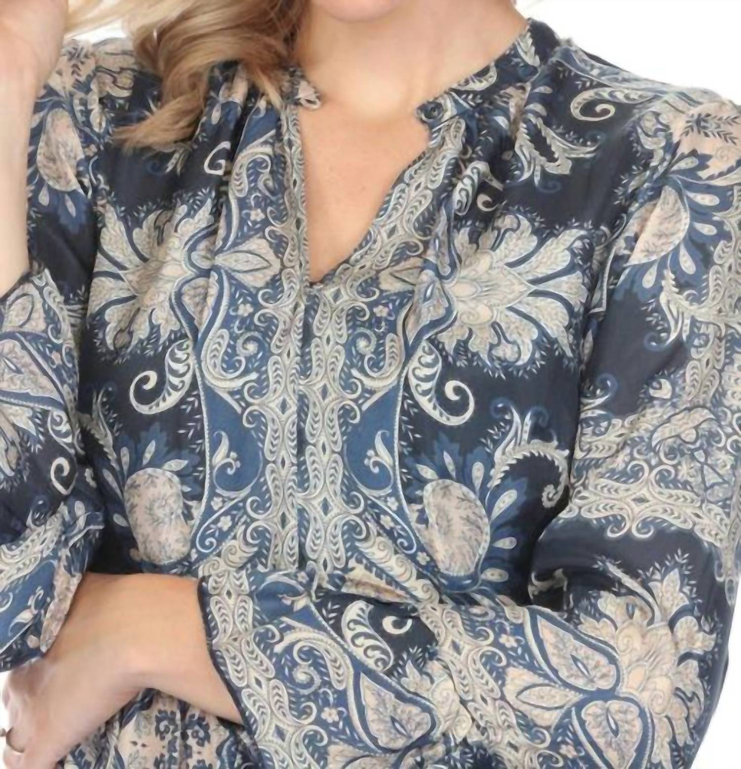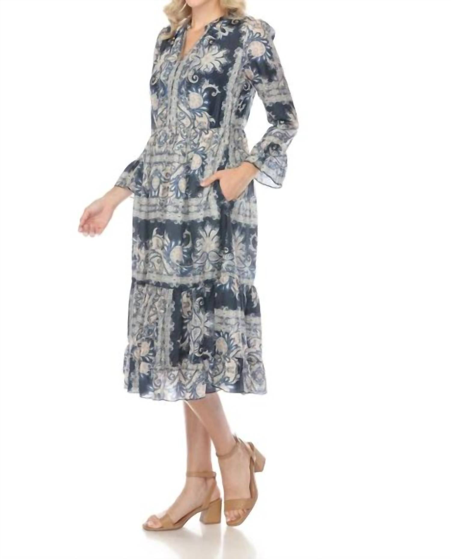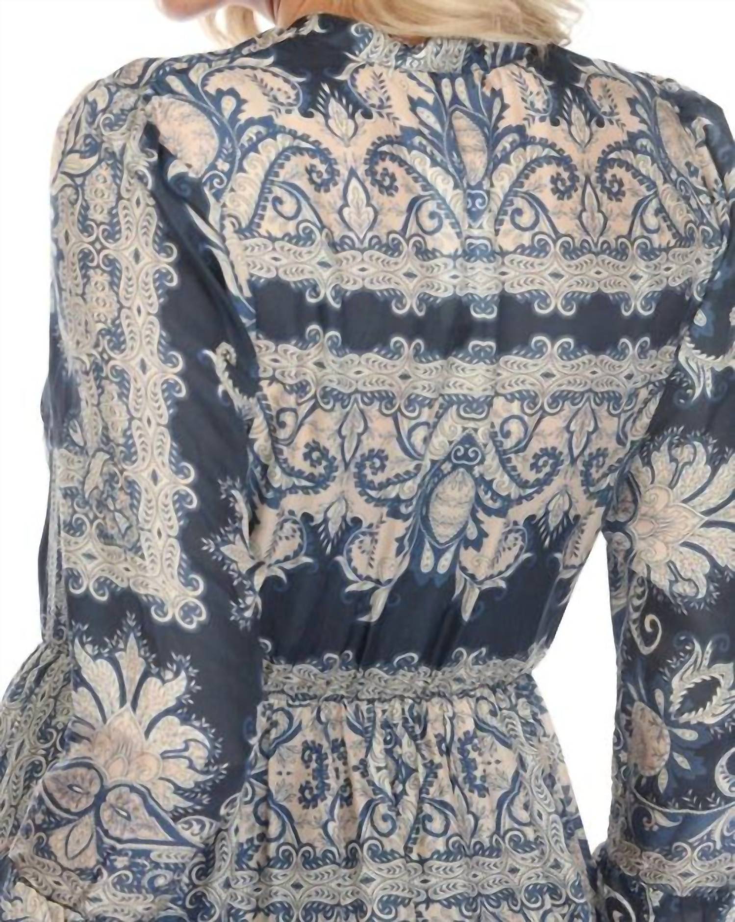 The perfect length dress does exist. The Lucrezia Dress is embellished with a brilliant kaleidoscope of color and pattern and offers a relaxed silhouette. Crafted from 100% silk, this sleeved dress features a V-neckline and is finished with a bold paisley design. This classy dress has a button-down front, an A-line skirt, an elastic waist, and elasticated half-length sleeves. Hand Wash
