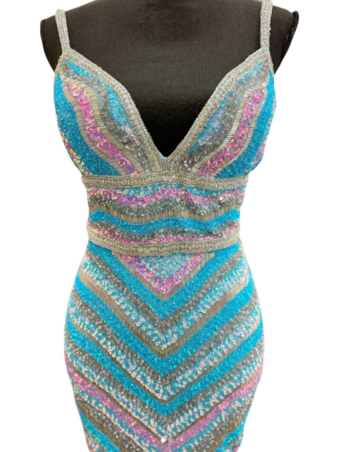 Looking for that perfect event dress? Look no further... Masterpiece in Blue Multi ideal for prom season. Sleeveless gown features a plunging V-neckline with delicate spaghetti straps for an alluring touch. Crafted from sequin fabric, boasts a striking floor-length sheath silhouette complemented by a dramatic high slit. Zip closure. Spot dry clean only.