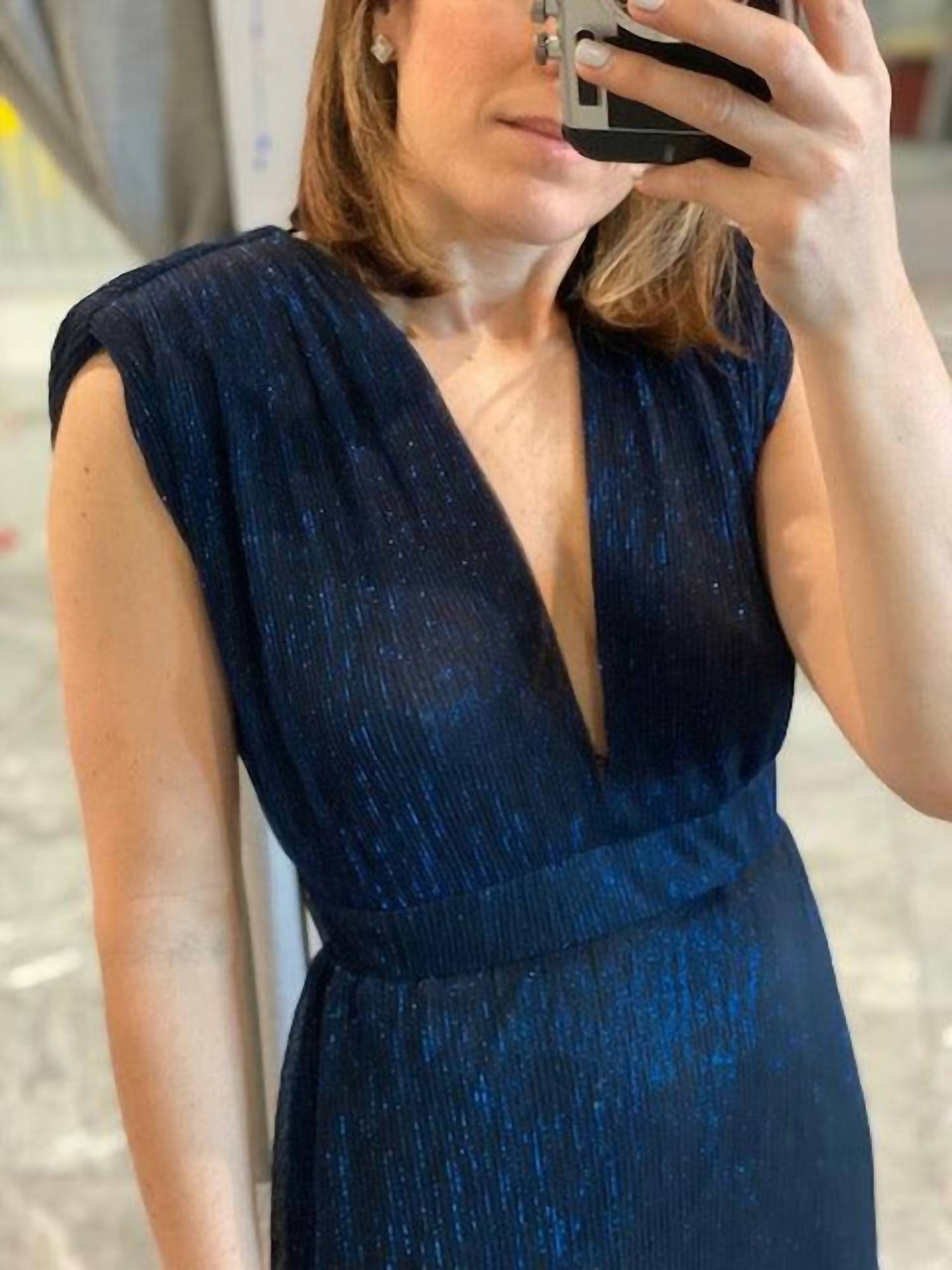 Style this maxi with your favorite statement necklace and sandals for the perfect look. Experience understated elegance with the Shimmer Maxi Dress by Karina Grimaldi, perfect for your next dinner party. This sleeveless dress features a deep V-neckline at the front and back, complemented by shoulder pad details for a structured look. Designed with a tiered A-line silhouette, the dress in textured navy blue offers a sophisticated shimmer ideal for spring affairs. Closure: Elastic waist.