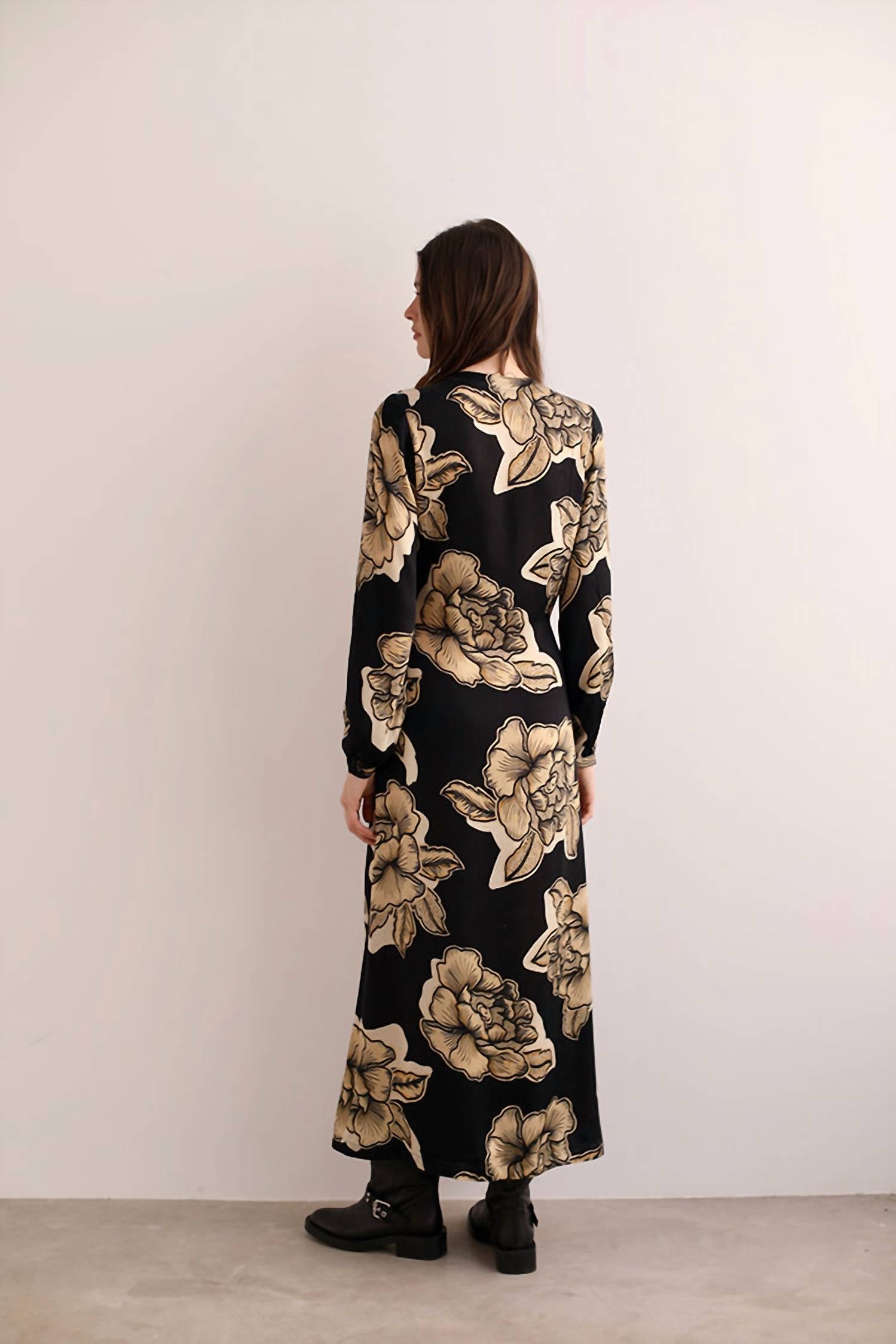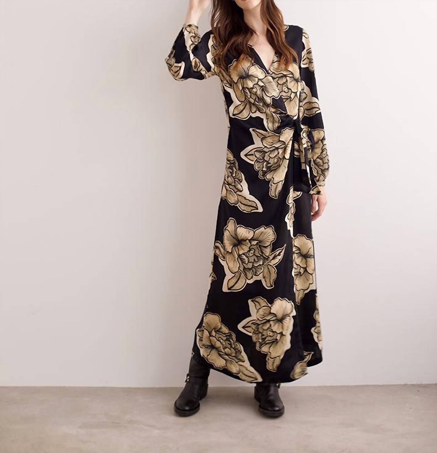A maxi dress that is just as cute as it is comfortable. Introducing the Sticker Long Dress by Las Sureñas, a stunning maxi dress perfect for vacation outings. Featuring long sleeves and a chic wrap silhouette, this dress is crafted from a luxurious silk blend with a captivating black and gold floral print. It includes a tie closure belt to highlight your waist in a flattering V-neck design. For best care, dry clean only to maintain its elegant finish.