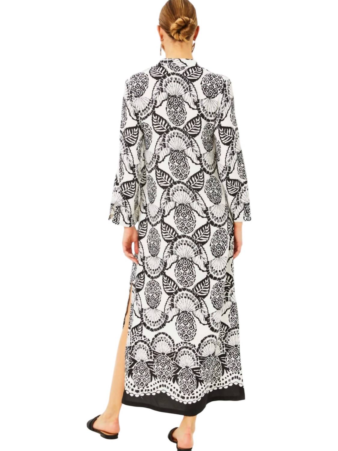 A maxi dress that is just as cute as it is comfortable. Perfect beach day piece radiating Boho Chic vibes. Easy-fit maxi dress features three-quarter sleeves and a striking Coconut Pineapple Princess print. V-neck design is adorned with a beaded placket, complemented by a stand collar and tall side slits for effortless elegance. Pull on closure. Ideal for summer gatherings, embrace its casual sophistication this Thanksgiving season.