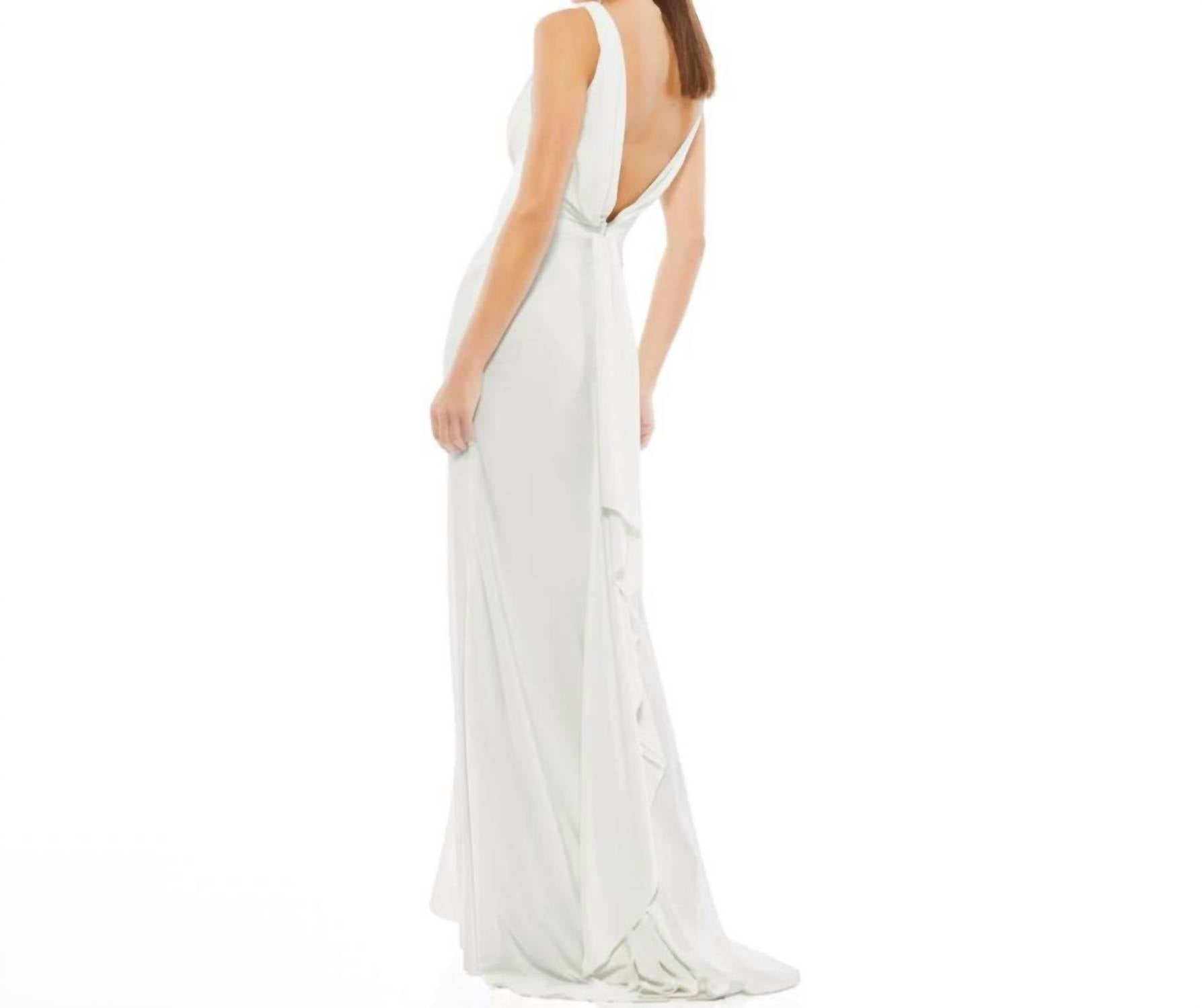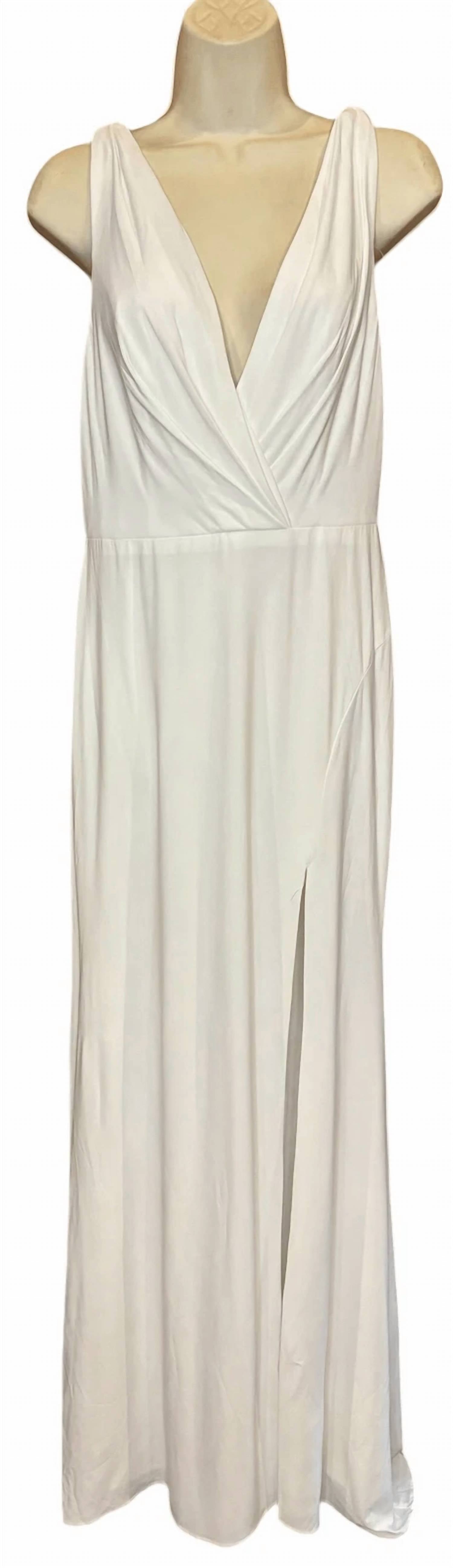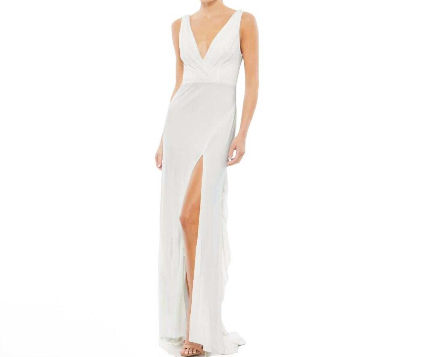 Style this maxi with your favorite statement necklace and sandals for the perfect look. Elevate your evening look with the Sleeveless Faux Wrap V-neck Slit Jersey Gown by MAC DUGGAL, an exquisite choice for women's event wear. Crafted from 100% polyester, this solid white maxi gown features a dramatic plunging-v back, gathered sweeping train, and high front slit. Designed in a shift silhouette, it offers a sophisticated style with a tie closure. With an approximate length of 62.5 inches from top of shoulder to bottom hem, this gown is a stunning option for spring occasions.