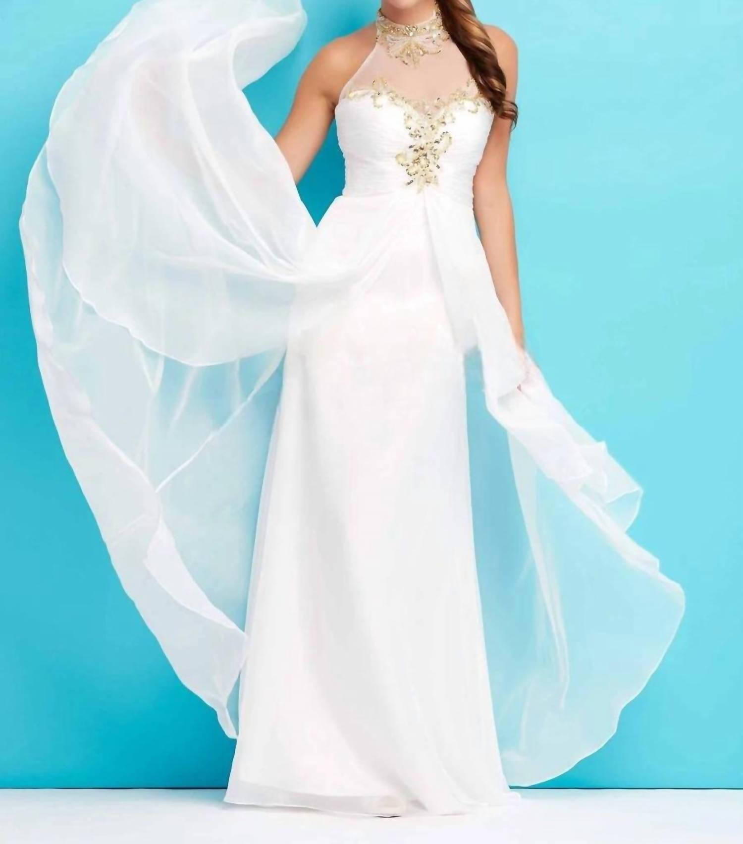 Turn heads in the cutest and most flattering evening dress. Step into the spotlight with the Mac Duggal Flowy Dress in a stunning Ivory/Gold colorway, perfect for any prom event. This sleeveless halter top dress features a ruched bust and bodice adorned with sequins, complemented by a lightweight, flowy layered skirting and mesh chest covering. The fit and flare silhouette accentuates your figure, while the zip closure ensures a secure fit.