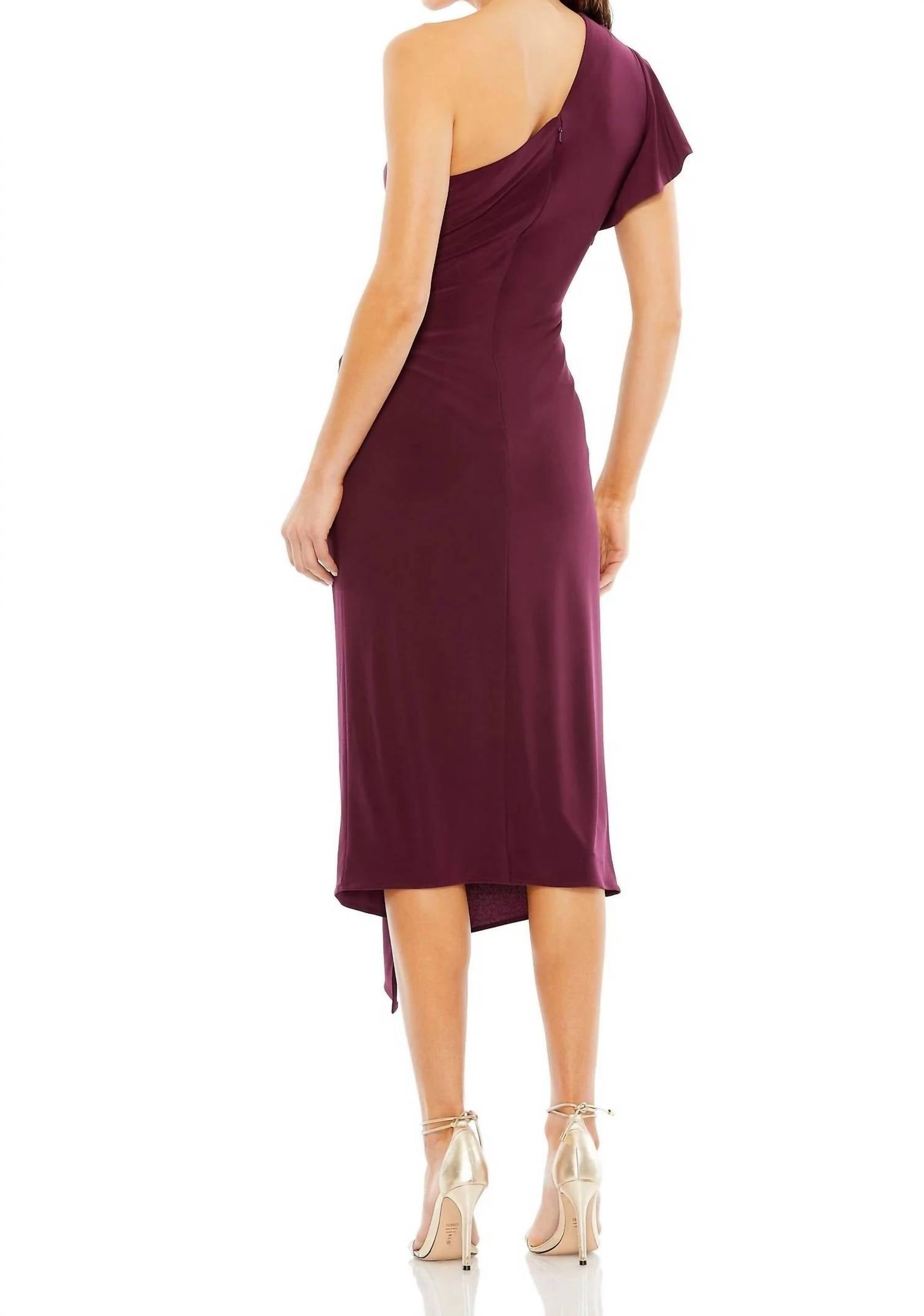 A midi dress so versatile, your options for wearing it are endless. Experience effortless elegance with the Mac Duggal 12480 cocktail dress, expertly crafted from luxurious jersey fabric that offers both comfort and a flattering fit. This gown features a form-fitting silhouette with expertly ruched detailing that accentuates your curves, complemented by a striking one-shoulder neckline and an asymmetrical hemline for a modern, captivating look. The short sleeve adds sophisticated allure, while the discreet back zipper ensures a seamless fit. Designed with a mid-length cut, this dress embodies refined glamour and confidence, making it perfect for upscale evening events.