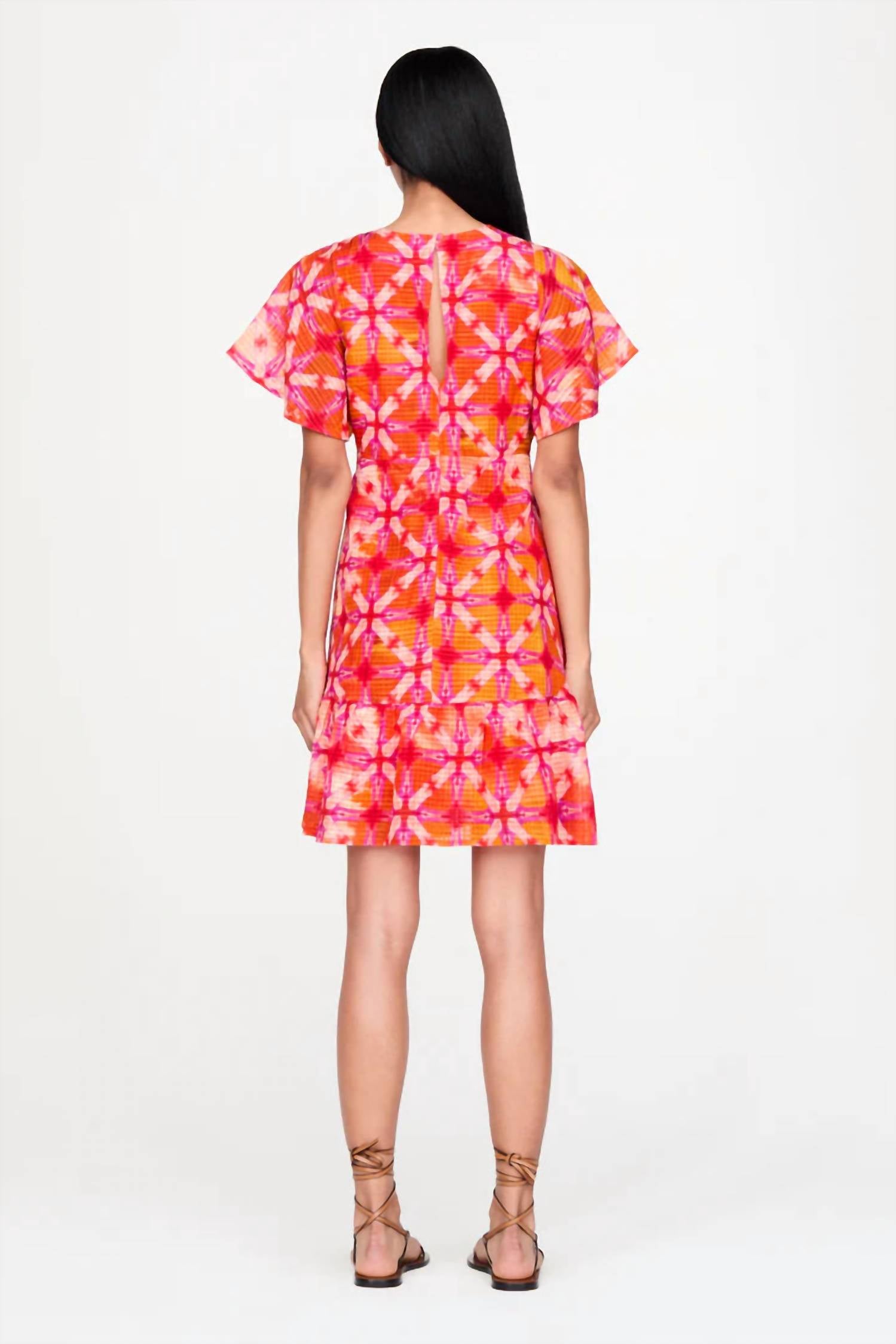 A short and breezy dress for those warmer days. Bold Guava tie-dye design. Flirty, short mid-thigh style. Feminine ruffle sleeves. Flattering V-neck. Keyhole back. Single flounce hem. Fit and Flare Waist. 56% Viscose, 44% Linen. Dry Clean Only.