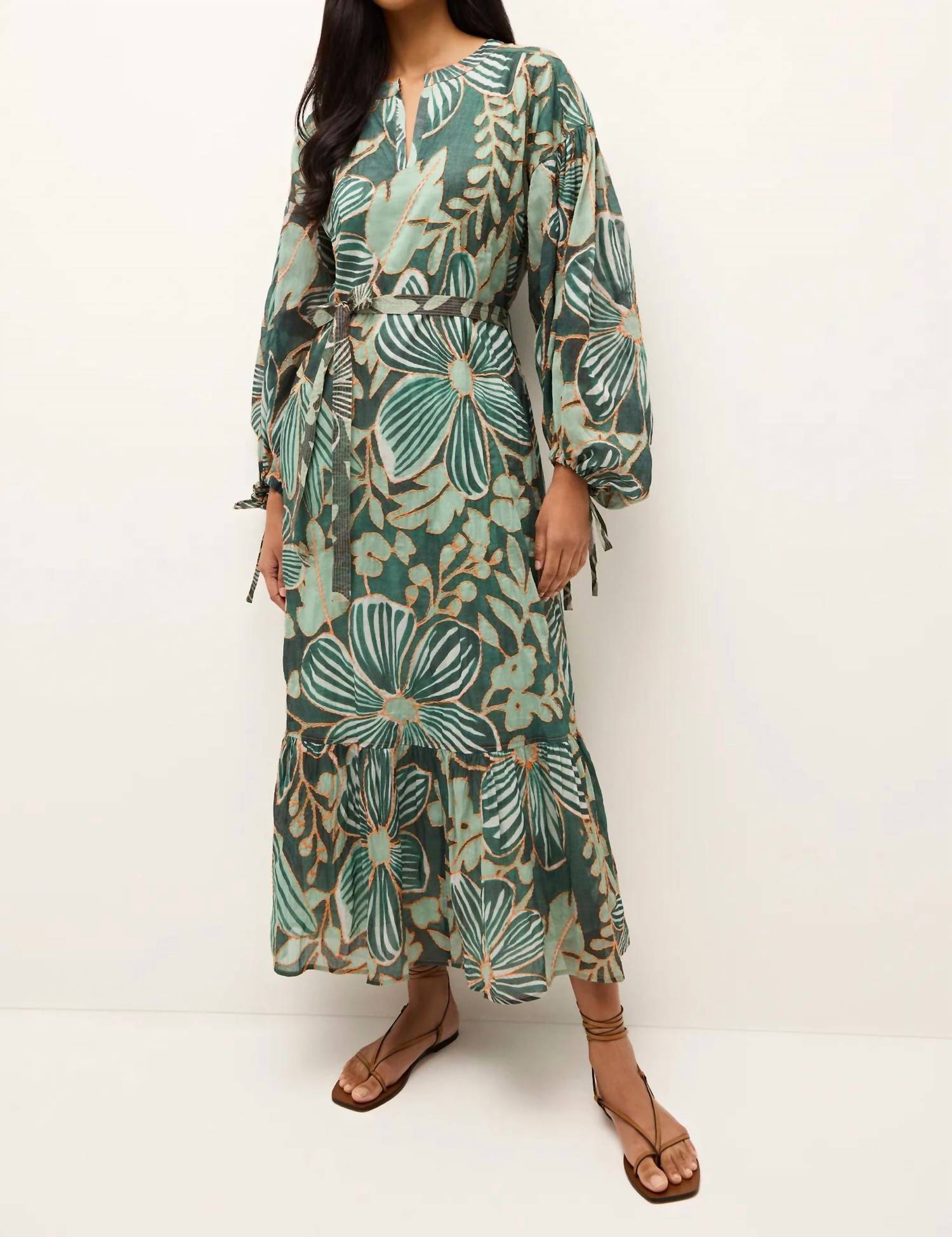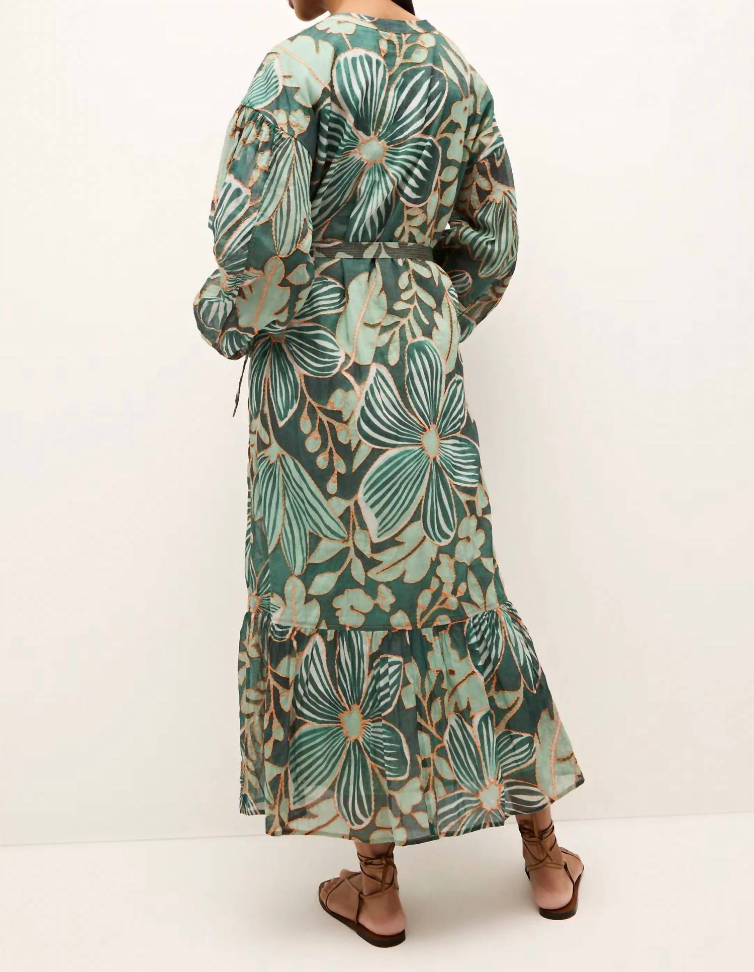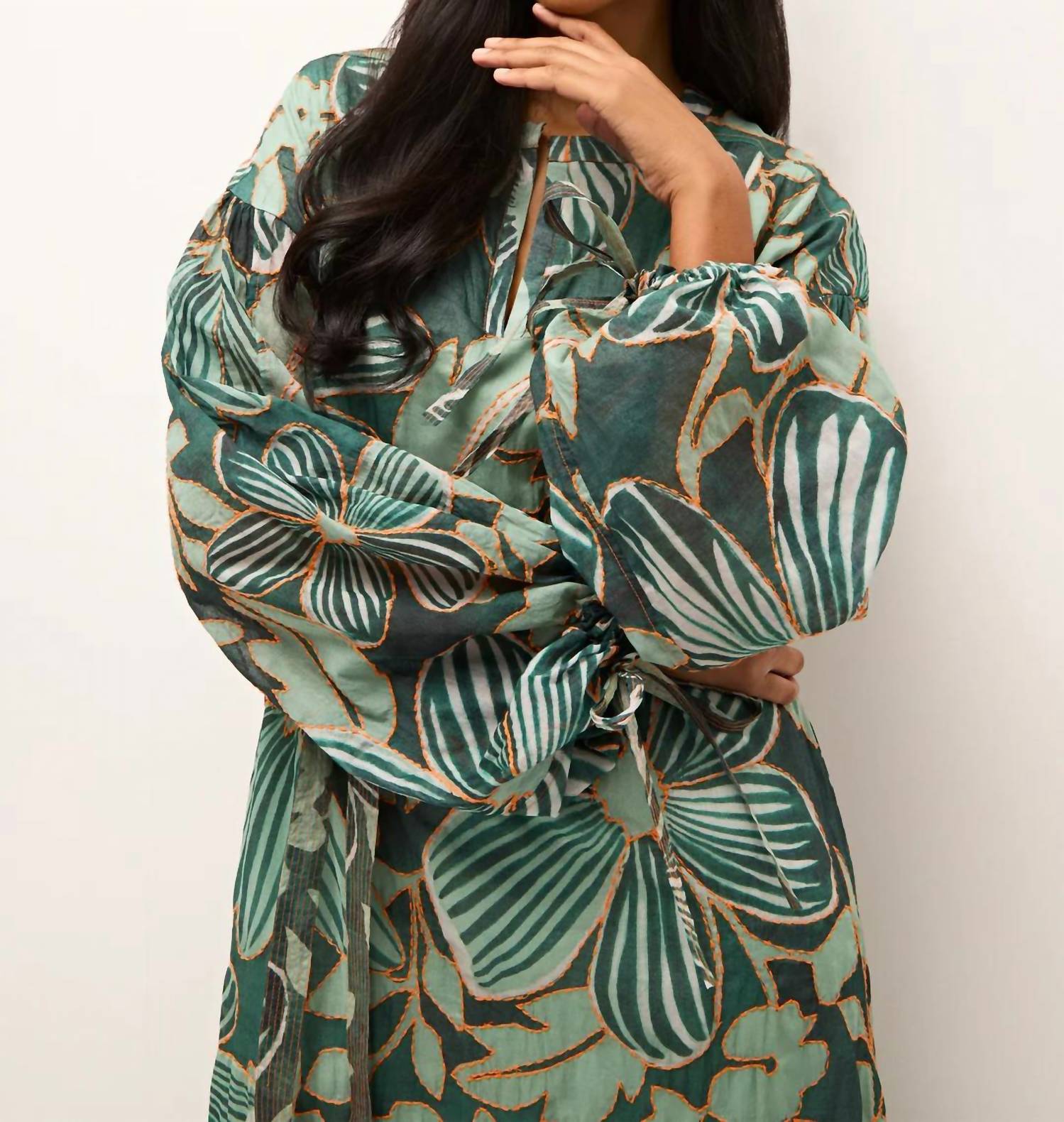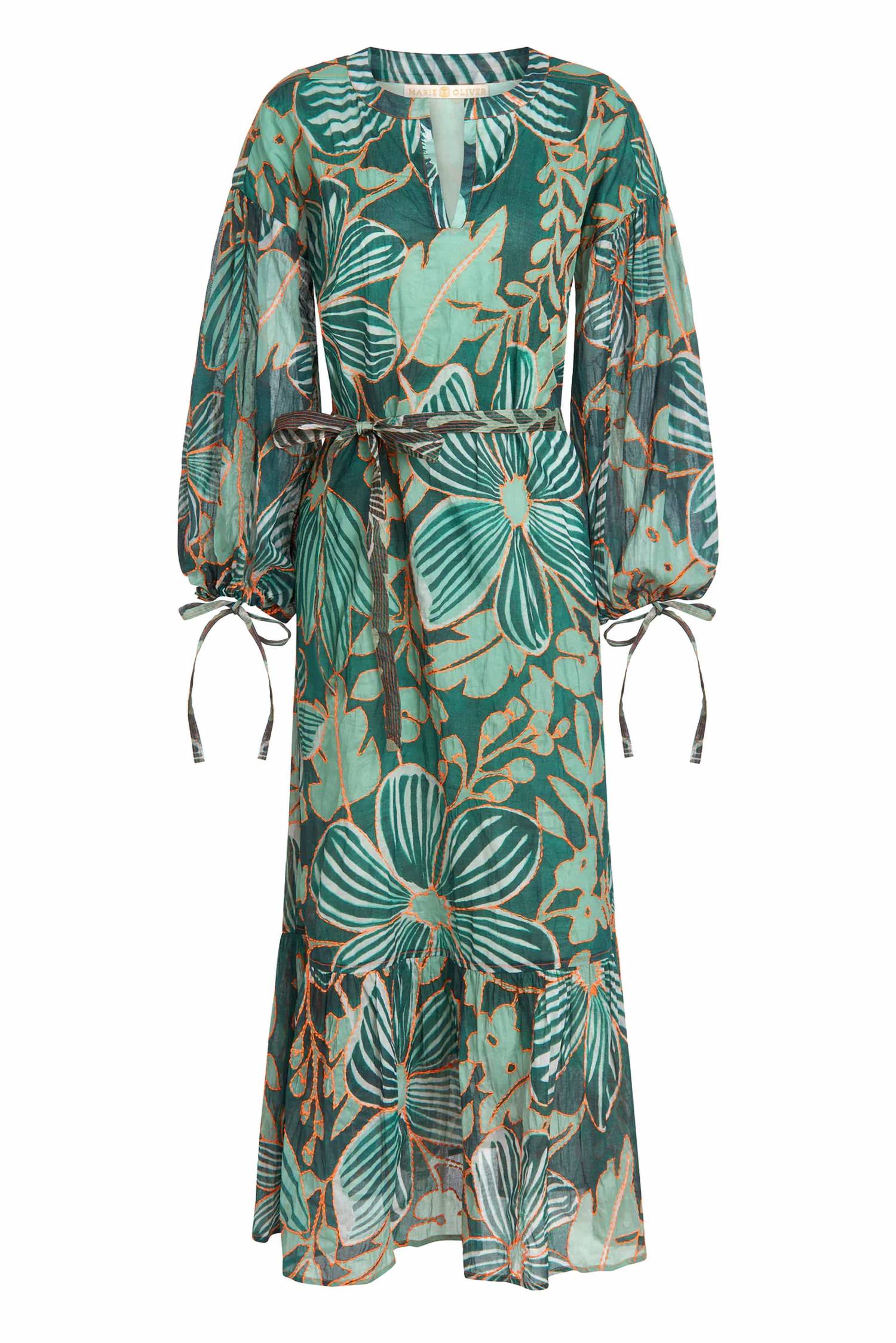 Introducing the Tabitha Dress by Marie Oliver, a stunning Primavera-inspired kaftan perfect for maxi dress enthusiasts. This elegant piece features long balloon sleeves that cinch at the wrist with tie cuffs for added flair. The dress is crafted from 100% cotton organza, boasting a unique floral pattern and intricate orange embroidery by Indian artisans. Closure: Slip-on with a hook and eye at the front neck. Care: Machine wash separately in cold on a gentle cycle, lay flat to dry, or opt for dry cleaning.