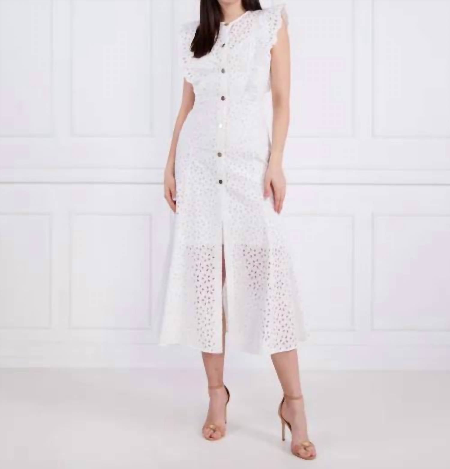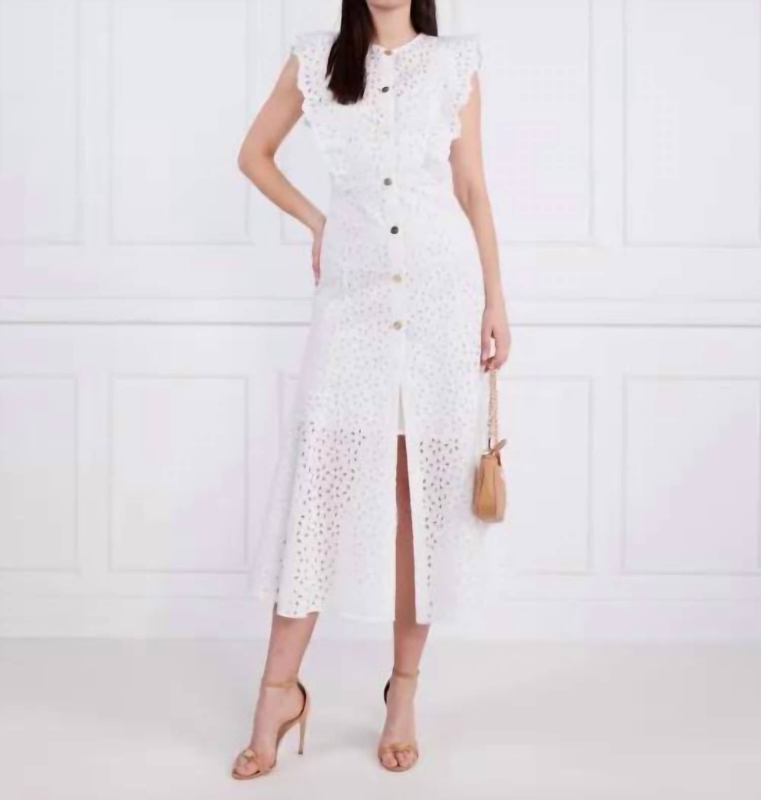 Just add slides or mules and you are good to go. Presenting the Admirable Cotton Embroidery Dress by PINKO, an exquisite choice for your wardrobe in crisp white. This midi dress boasts short sleeves and is crafted with a delightful outer material composition of 100% Cotton, fully lined with 100% Viscose. The dress ensures both elegance and comfort, closing neatly with buttons for an easy fit. Enjoy hassle-free maintenance with its machine washable fabric, making it perfect for a variety of occasions.