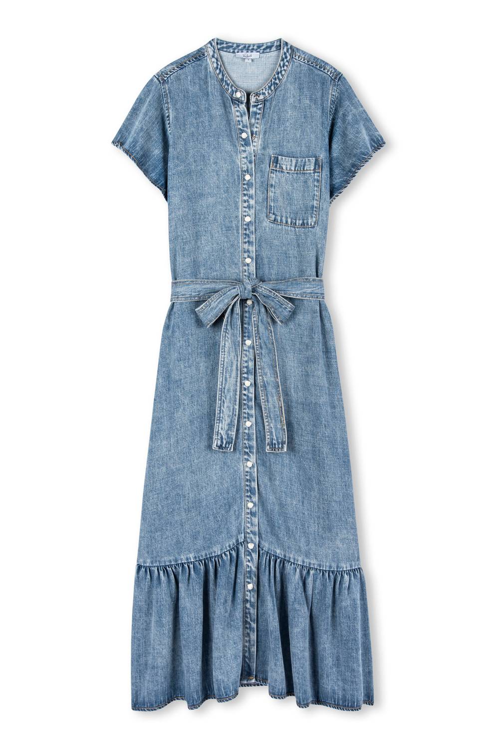 The perfect length dress does exist. Introducing the Rails Kahlo Midi Dress, a standout piece crafted in denim with a playful flounce hem and fluttering short sleeves. Made from a blend of Tencel and Rayon, this stylish dress in mid blue offers both comfort and chic elegance. Featuring a snap front closure, it's an ideal choice for any occasion. Care for this dress is easy: simply machine wash cold and tumble dry low.