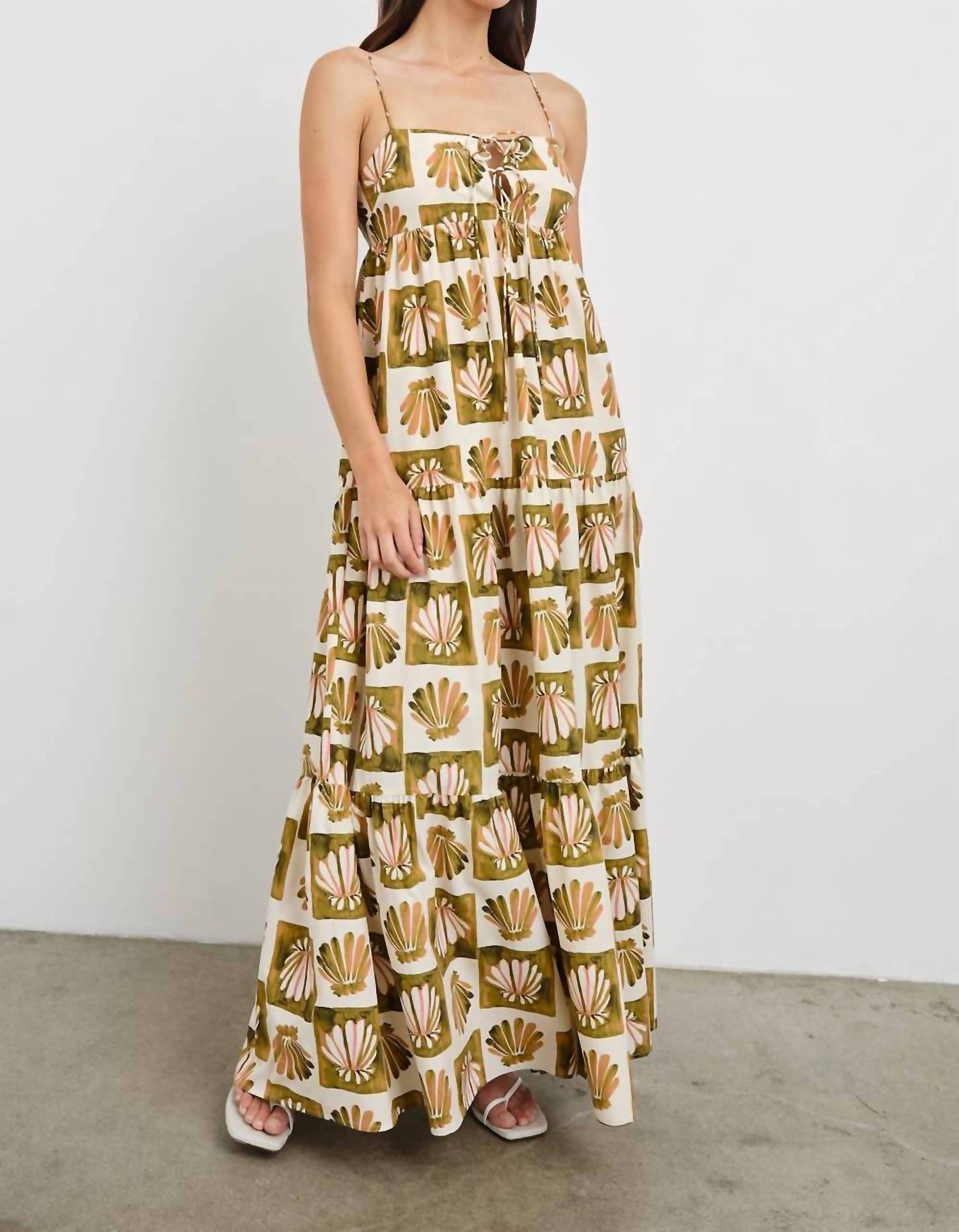 Style this maxi with your favorite statement necklace and sandals for the perfect look. Elevate your vacation wardrobe with the Mica Maxi Dress by Rails, a stunning piece in Checkered Shells. The dress features spaghetti straps and a squareneck, enhancing its A-line silhouette for a flattering fit. Crafted from a blend of 55% cotton and 45% tencel, it ensures breathability and comfort, perfect for the boho chic trend. Designed with a fitted bodice and full, flowy skirt, this pull-on style is fully lined and runs true to size. Care: Hand wash cold. Imported.