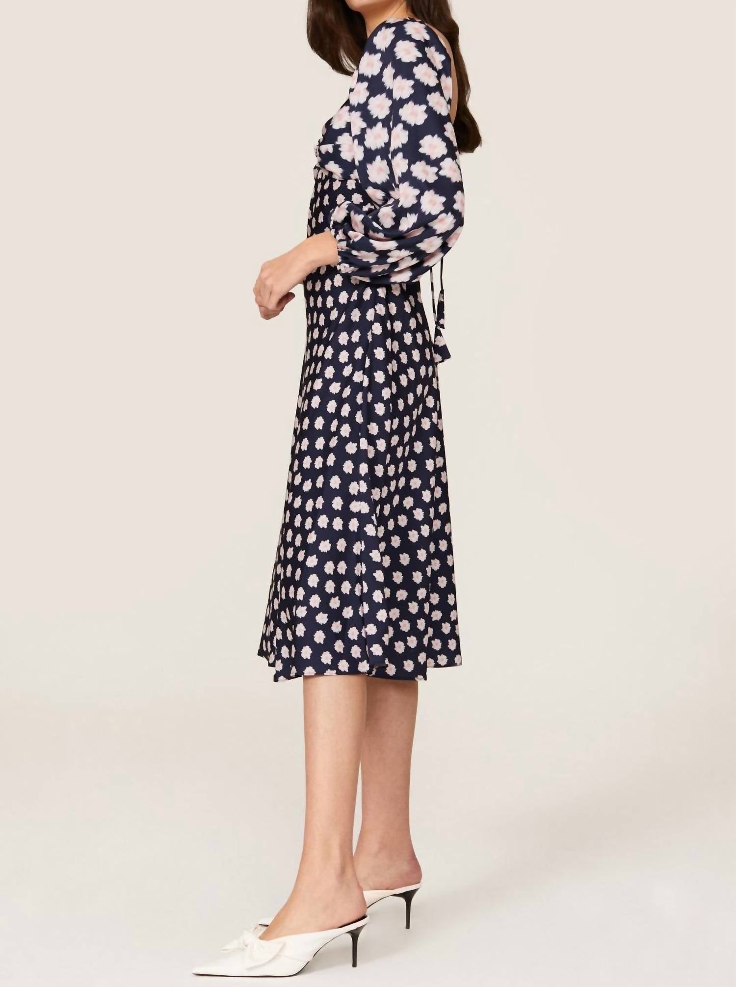 The perfect length dress does exist. The Sachin & Babi Melody Floral Crepe Midi Dress is a stunning choice for a dinner party, featuring an A-line silhouette that flatters every figure. With long sleeves and made from luxurious satin crepe composed of 100% polyester, this navy dress captivates with its feminine floral pattern. It has a semi-open back accented by a non-functioning tie with hand-made cone tassel embellishment, and a side zipper closure ensures ease of wearing. Perfect for spring occasions, the dress measures 18 inches across the chest.