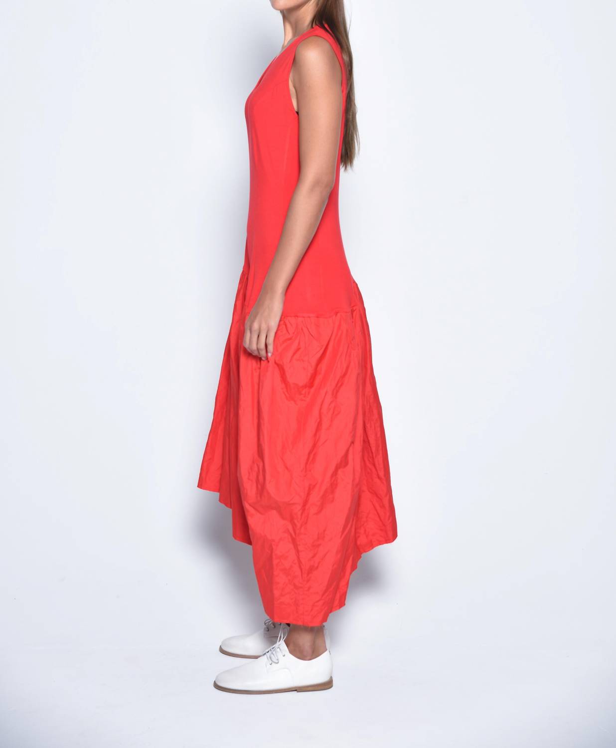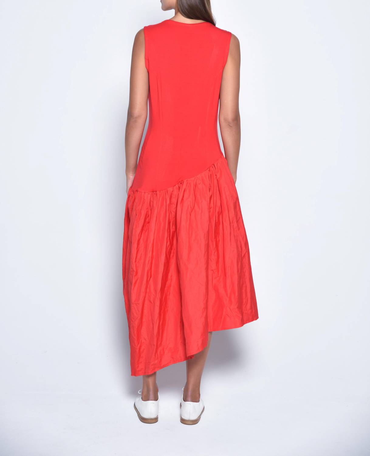 A cool twist on a classic style dress. Introducing the Amman Asymmetrical Dress by Simply Mila, a stunning sleeveless piece crafted in a red cotton blend, perfect for your summer wardrobe. Designed with a trendy A-line silhouette, this dress features a V-neckline and a drop-waist that adds volume and movement. Made in the USA, it offers the comfort of a smooth stretch jersey top with a crinkled skirt, complete with practical pockets. Closure: Pull on. Care is easy with machine wash on a delicate cycle and tumble dry low.