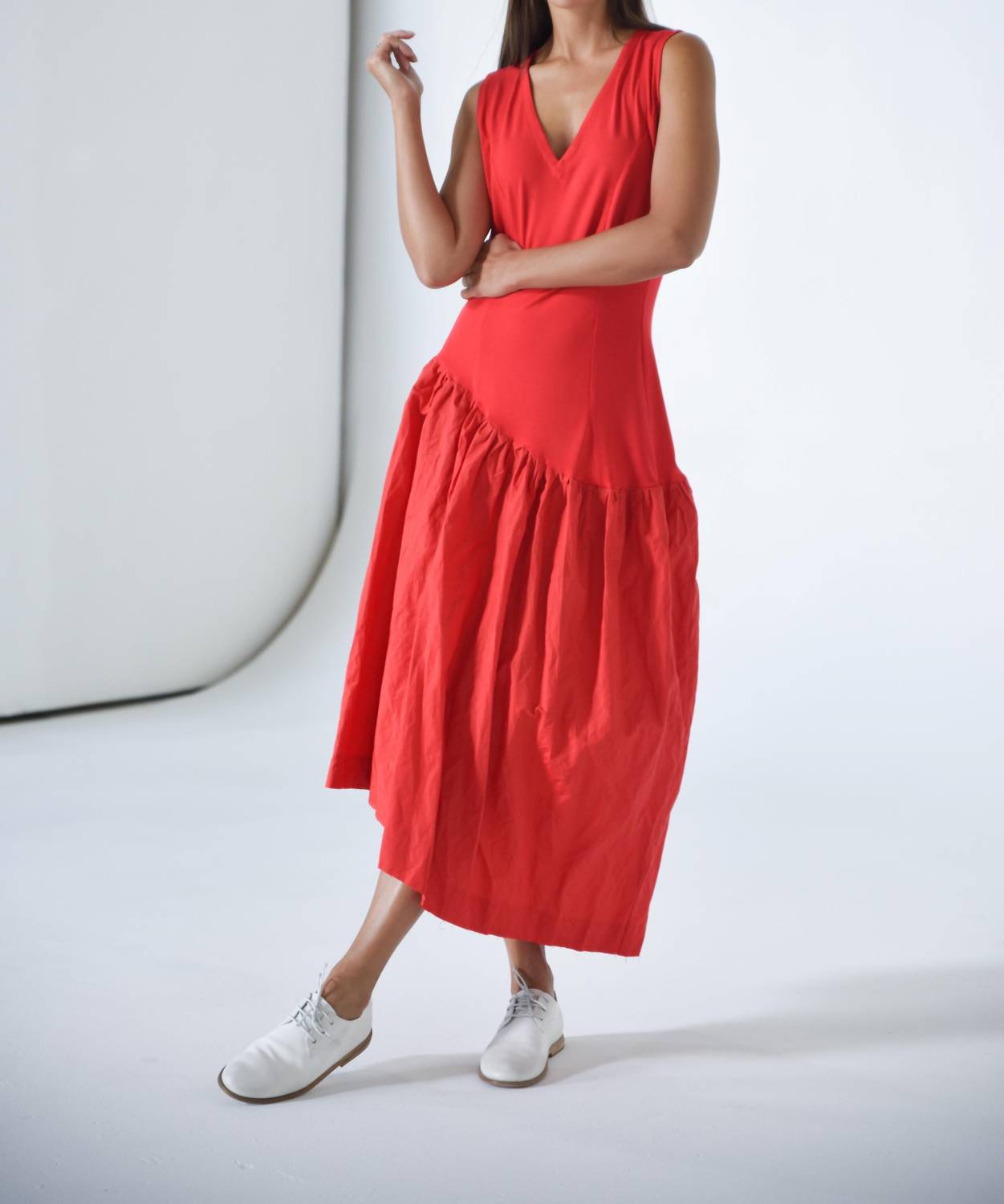 Introducing the Amman Asymmetrical Dress by Simply Mila, a stunning sleeveless piece crafted in a red cotton blend, perfect for your summer wardrobe. Designed with a trendy A-line silhouette, this dress features a V-neckline and a drop-waist that adds volume and movement. Made in the USA, it offers the comfort of a smooth stretch jersey top with a crinkled skirt, complete with practical pockets. Closure: Pull on. Care is easy with machine wash on a delicate cycle and tumble dry low.