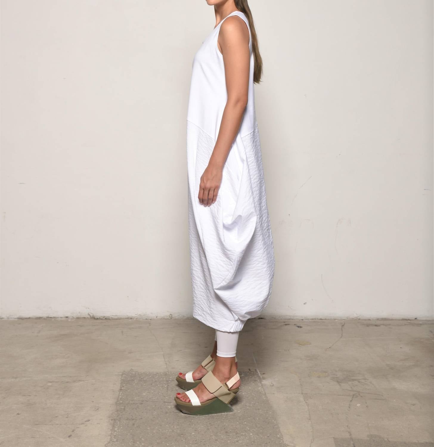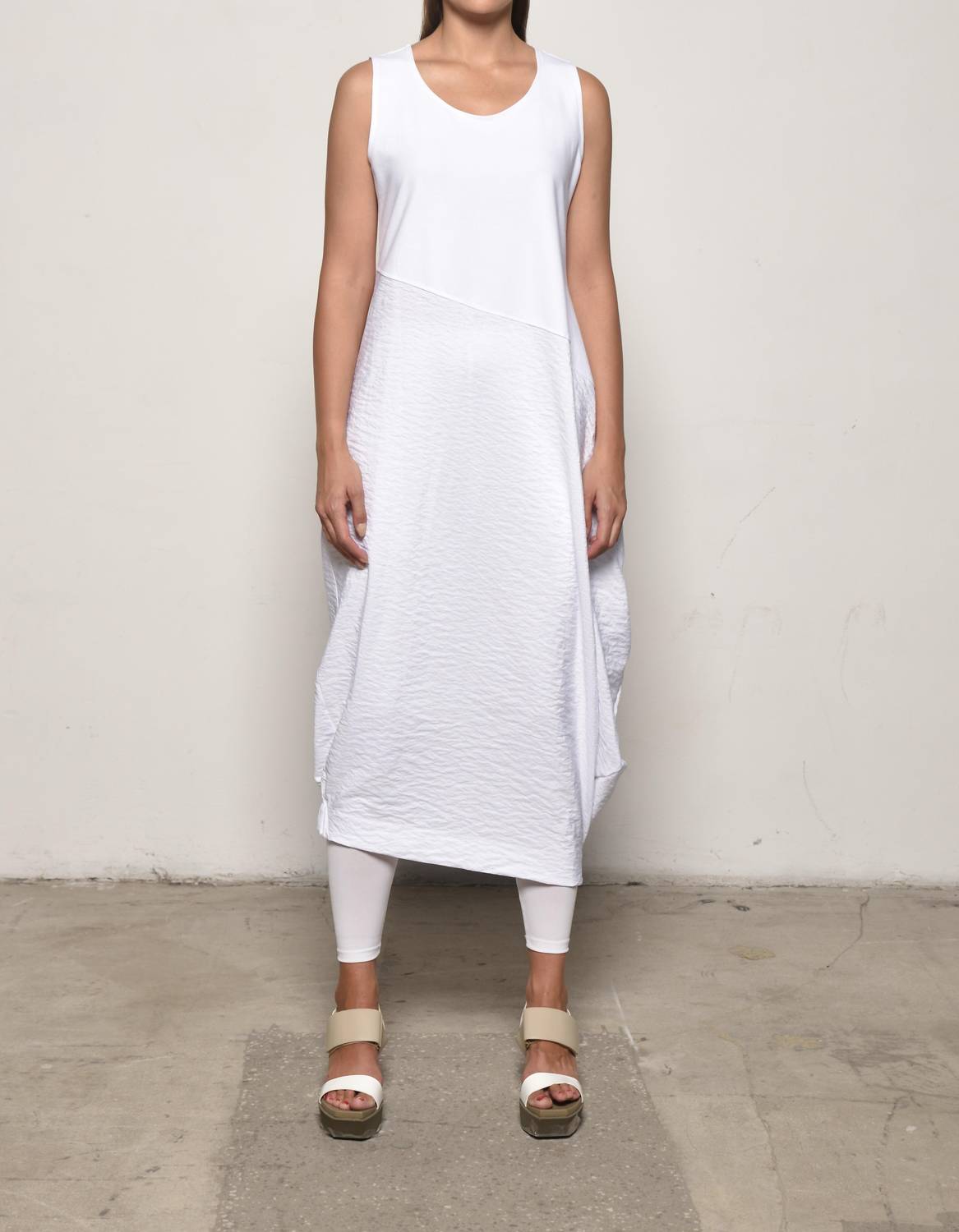 Introducing the Babylon Sleeveless Dress by Simply Mila, a chic piece perfect for your summer vacation wardrobe. This A-line midi dress in solid white features a practical pocket design and a flattering scoop neckline. It is crafted with a top composition of modal and spandex, and a crinkle nylon/poly bottom, proudly made in the USA. Closure: Pull on. Care: Machine wash cold on a delicate cycle, inside out. Air dry and use a cool iron if needed.