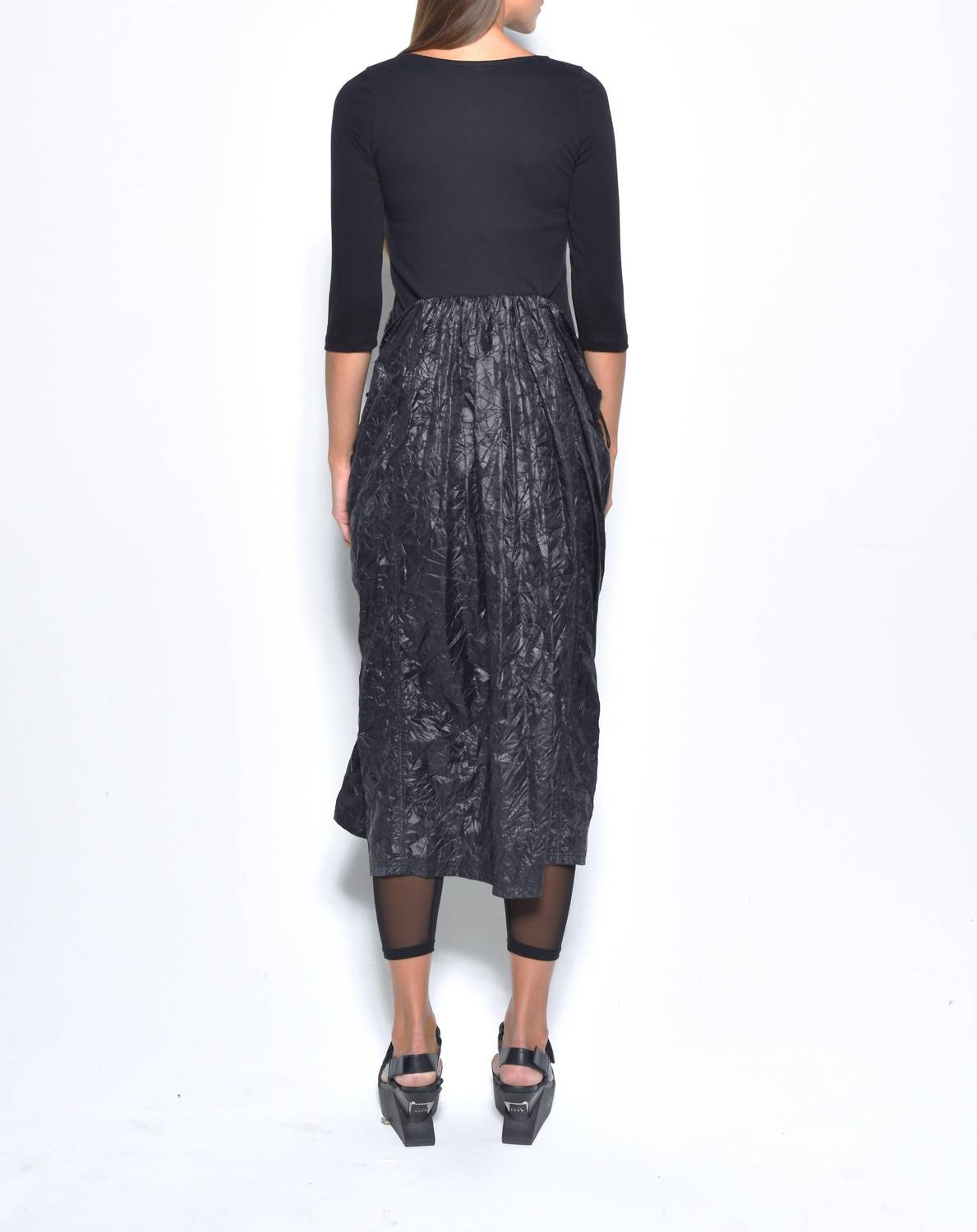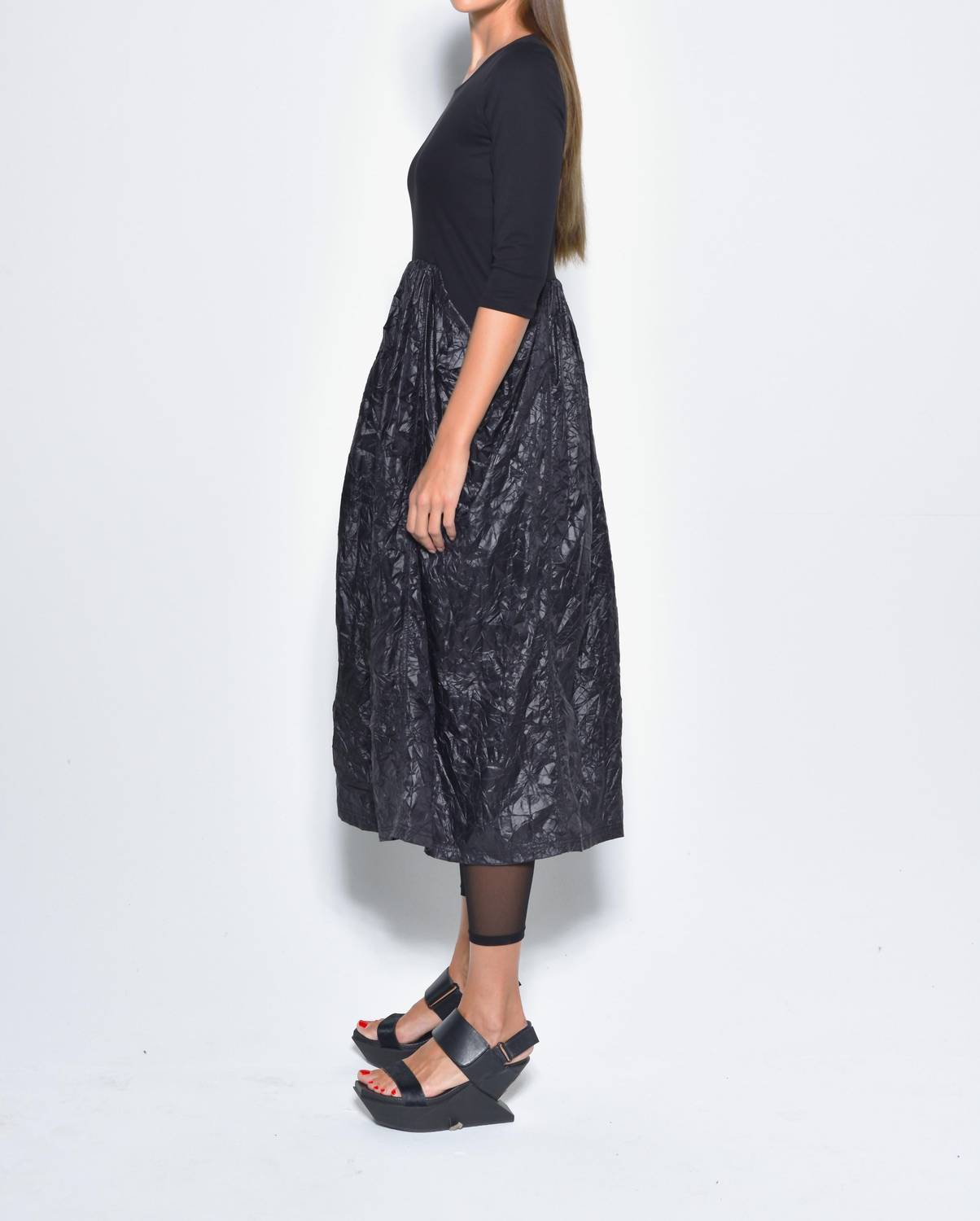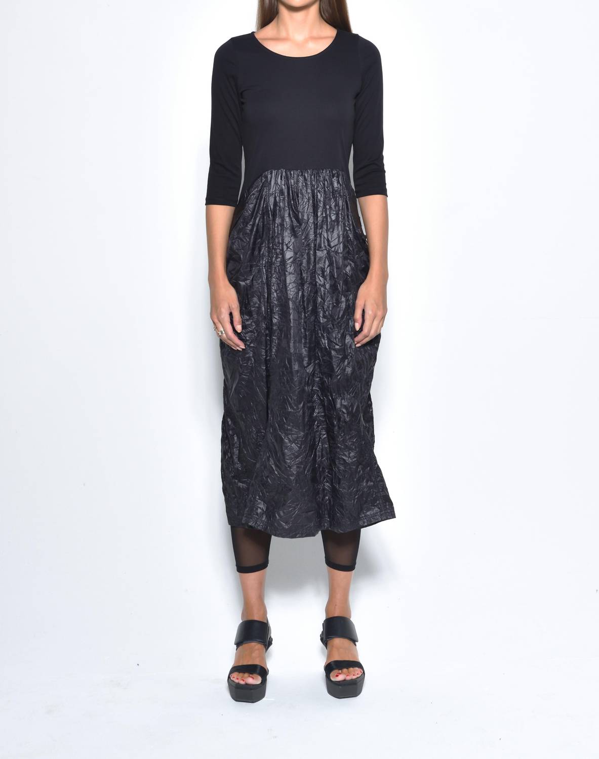 Discover the Hydra Midi Dress by Simply Mila, a sophisticated piece perfect for evening events that exudes quiet luxury in timeless black. This dress features three-quarter sleeves and a graceful A-line silhouette with a crewneck, crafted from 100% cotton for the main body and a contemporary 100% crinkle nylon skirt overlay. Made in the USA, it offers an effortless pull-on closure for ease of wear. Care: Machine wash cold, delicate cycle, air dry, and cool iron if needed. Available in sizes XS-XL, with bust measurements ranging from 28" to 36.5" and a length of 47" to 50".