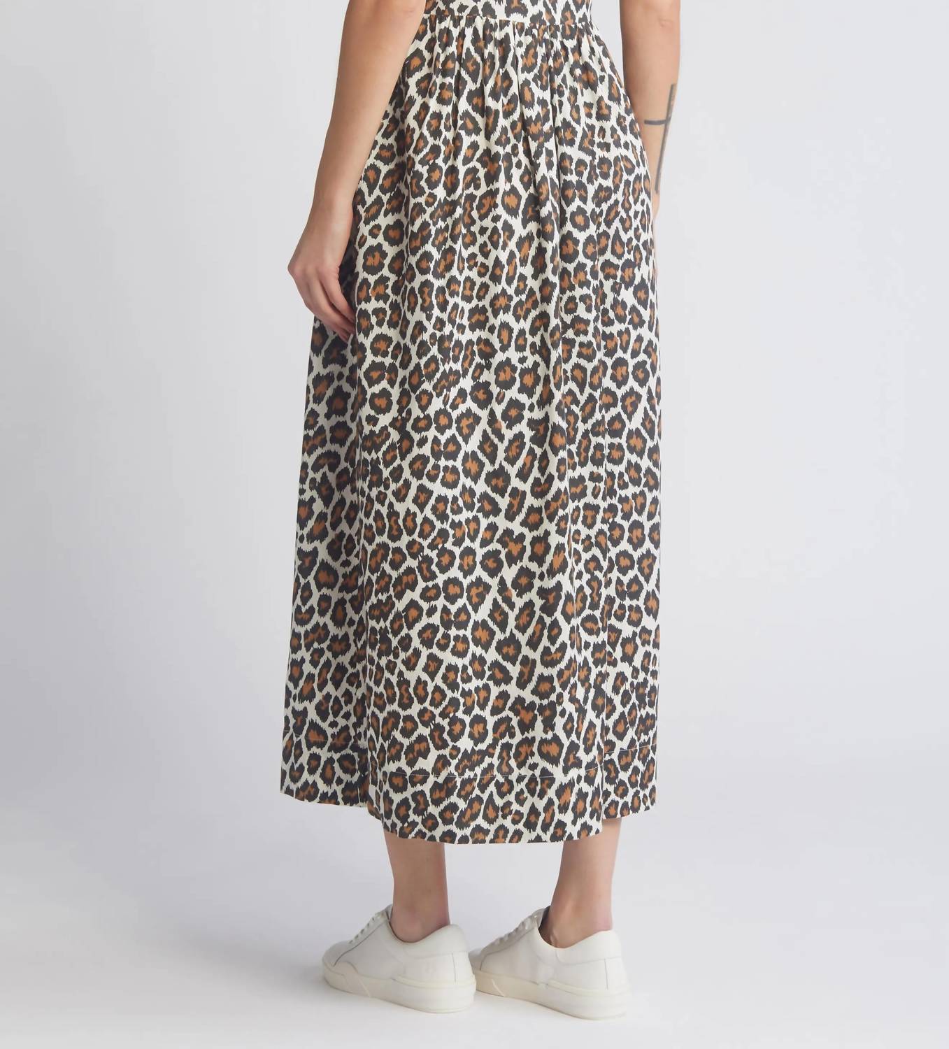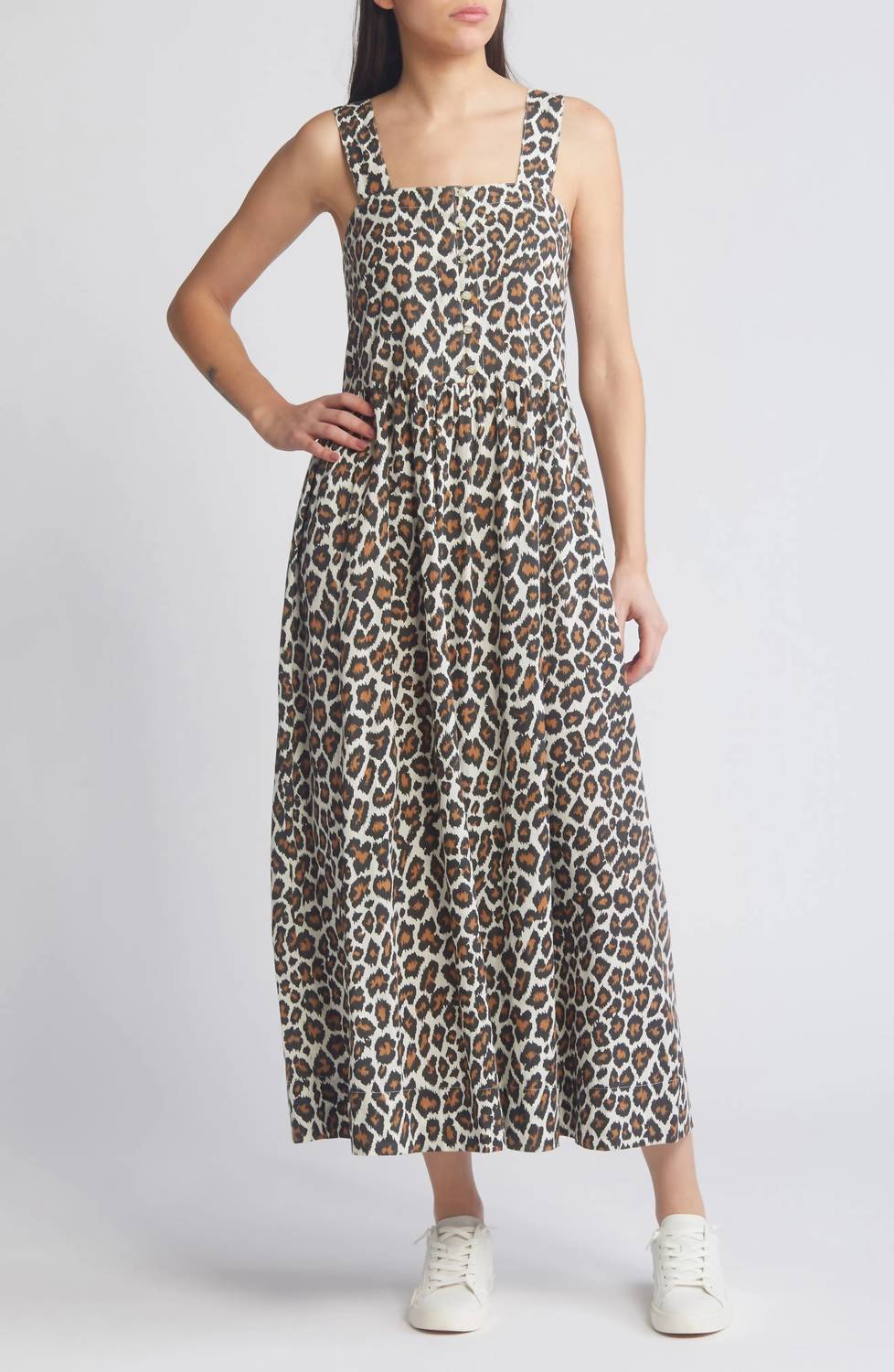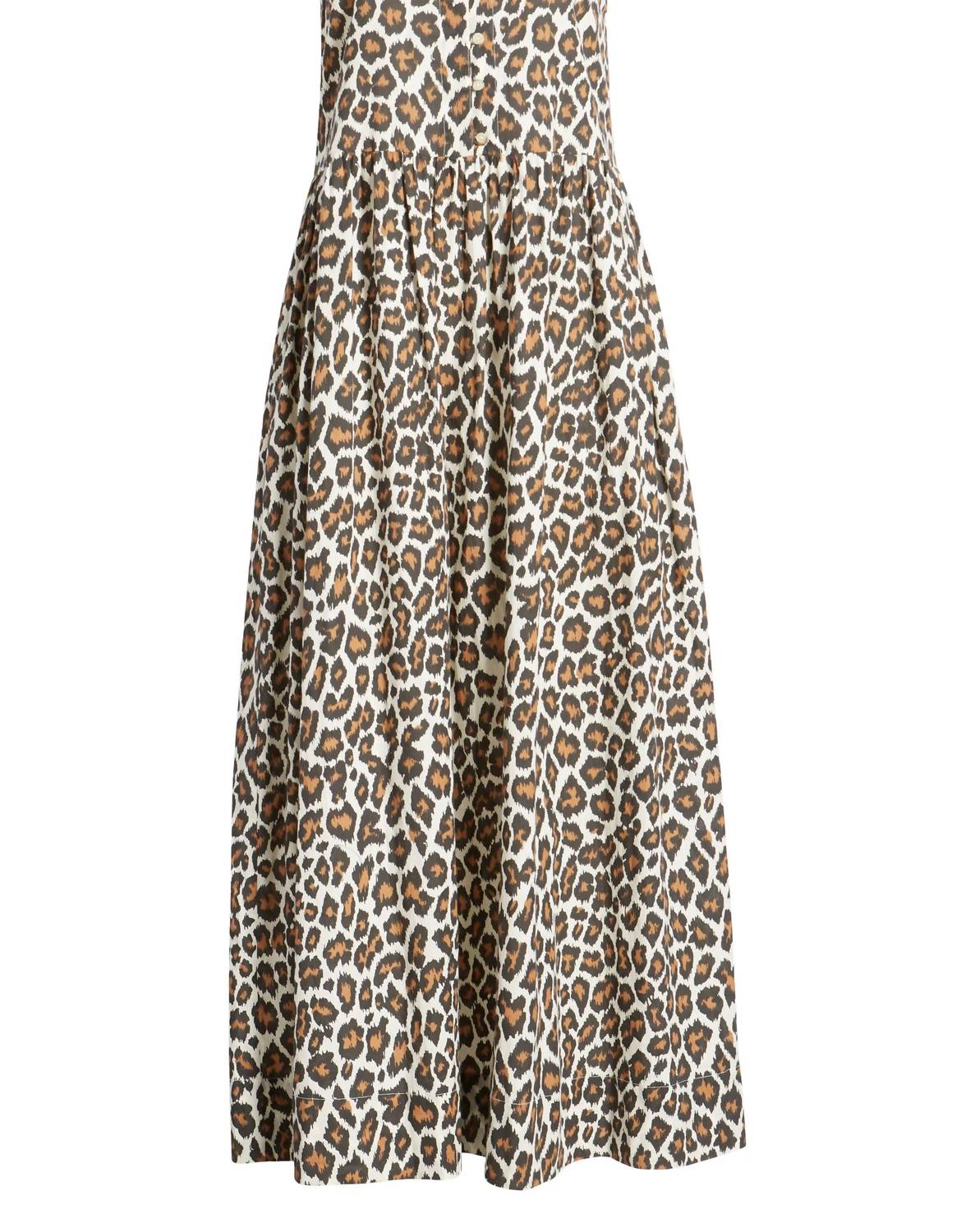 Who doesn't love a good maxi dress? This one you'll be reaching for season after season. Introducing THE GREAT. Sunbird Dress, an eye-catching summer essential in Heritage Leopard. This sleeveless maxi is crafted from 100% cotton with a light shadow stripe texture. Designed with a square neckline and button closure, its easy waistline and soft rouching offer a flattering fit that flows into a hemline just above the ankle. Care: Machine wash cold, tumble dry low.