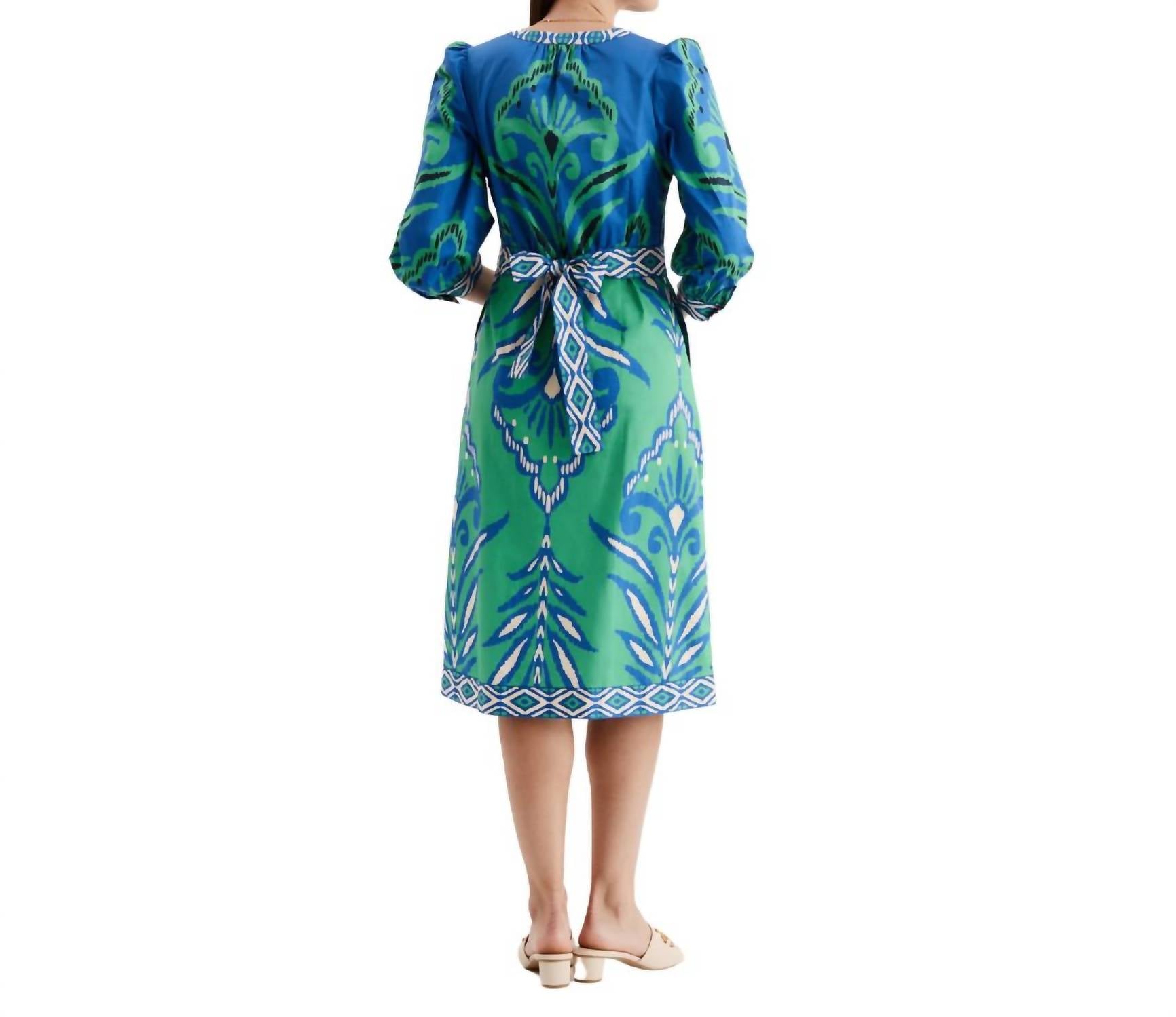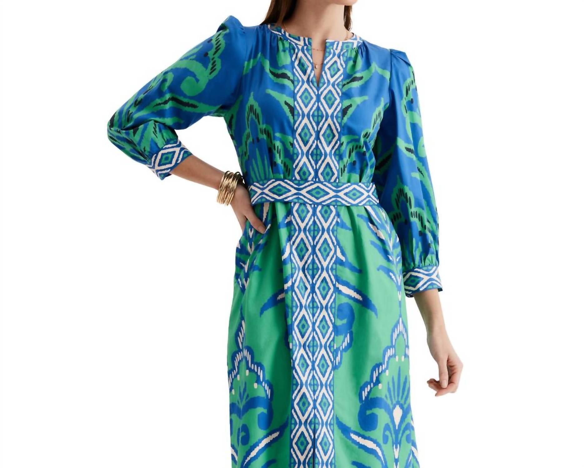 The perfect length dress does exist. Embrace the new season with the Kelsey Cotton Graphic Dress by Tyler Boe, a perfect blend of ease and elegance. Featuring three-quarter bracelet length sleeves and a flattering notch neckline with front placket, this A-line midi dress is crafted from 100% cotton for breathable comfort. Its striking mixed graphic pattern is tastefully placed along the V-neckline and waist, complete with functional side seam pockets. Care for this spring favorite by machine washing cold and line drying. Length is 46"; model is 5’9” wearing size S.