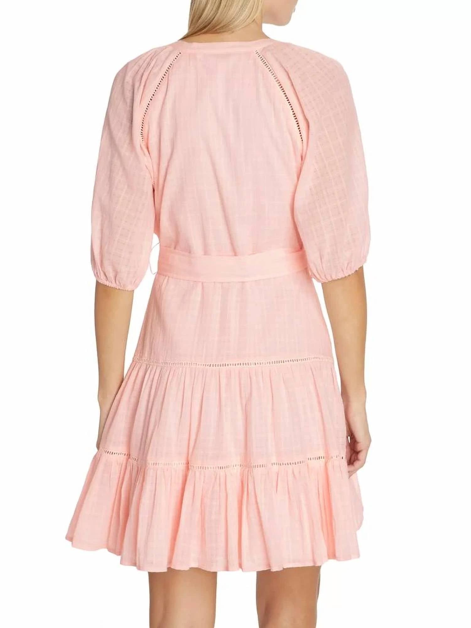 Introducing the Dewey Tiered Cotton Button-up Tie Waist Dress by Veronica Beard in a charming Pink-haze hue, perfect for your next holiday party. This mini dress boasts a V-neckline and short puff sleeves for a feminine touch, while the self-tie belt cinches the waist to accentuate its tiered A-line silhouette. Crafted from 100% cotton, it is designed with a button-front closure and measures approximately 36 inches from shoulder to hem. Imported and recommended for dry clean care, it's a quintessential piece for your spring wardrobe. Model is wearing a US size 4 and stands 5'10" tall.