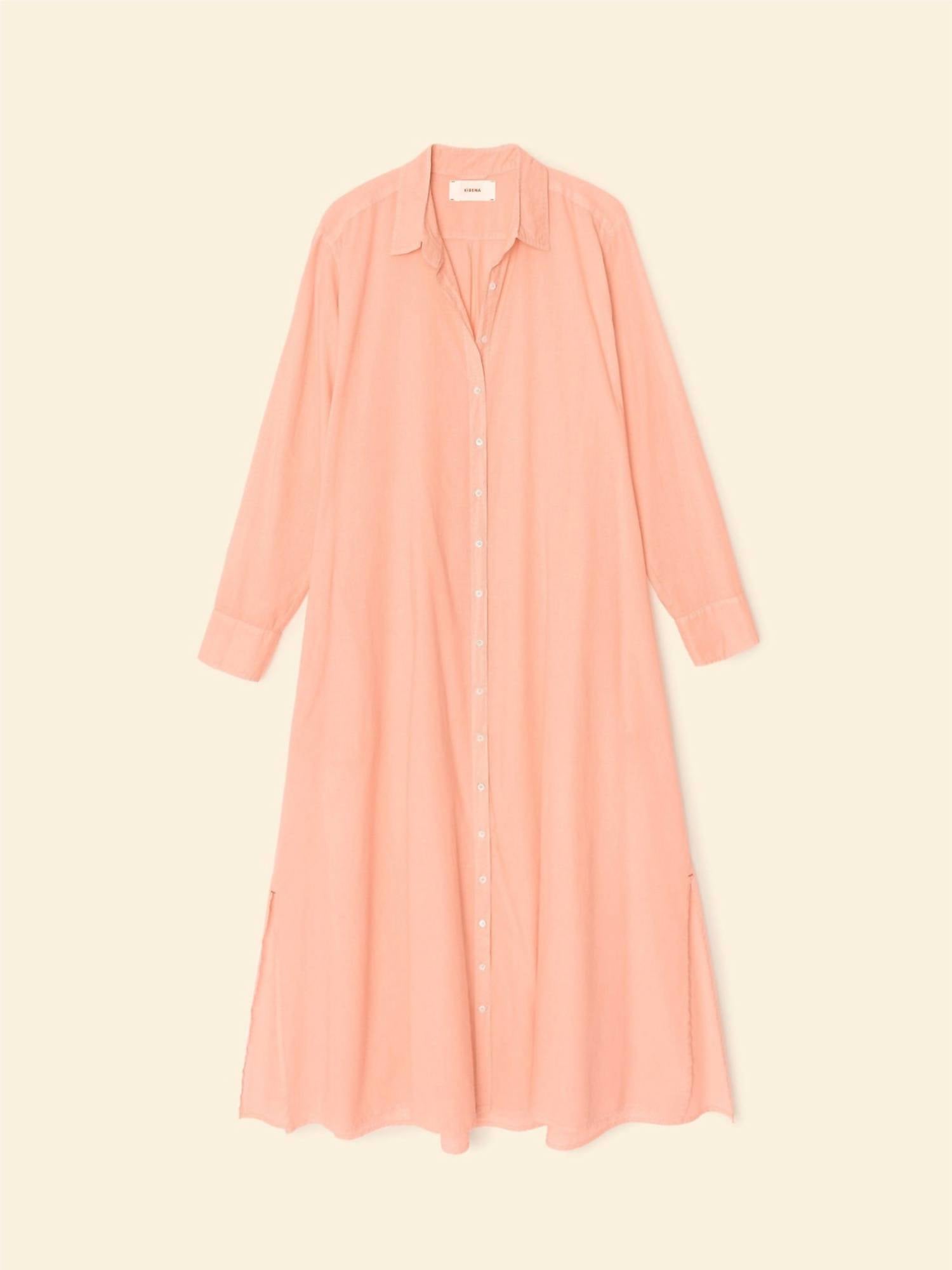 Just add slides or mules and you are good to go. Elevate your wardrobe with the Women's Boden Dress by XIRENA, a sophisticated shirtdress in a vibrant Grapefruit hue. Featuring long sleeves and a classic collar, this elegant midi dress is crafted from 100% lightweight woven cotton poplin for a comfortable fit. Closure: Button closure. Made in Los Angeles, it is both stylish and practical with side seam pockets and hem side slits. Care instructions: Machine wash cold on a gentle cycle and lay flat to dry. Model is 5'10" and wears a size Small.