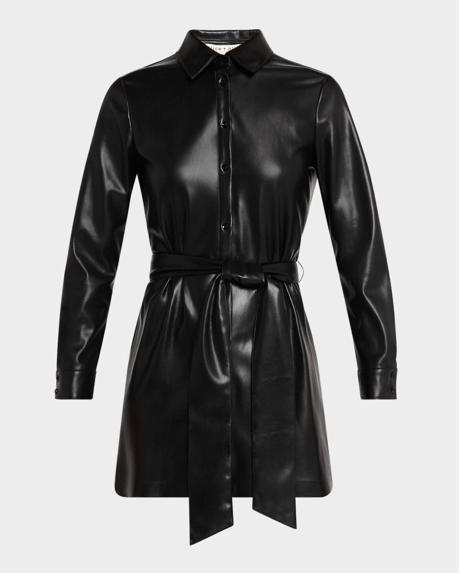 Introducing the Chassidy Vegan Leather Mini Dress by alice + olivia, a must-have for your evening events. This women's solid mini dress, in sleek black, sports a sophisticated collar and long sleeves for a touch of quiet luxury. Made from 100% polyurethane, the dress features a button closure, perfect for fall gatherings, especially Thanksgiving. Care is simple with dry clean only instructions, ensuring your dress remains stunning through numerous occasions.