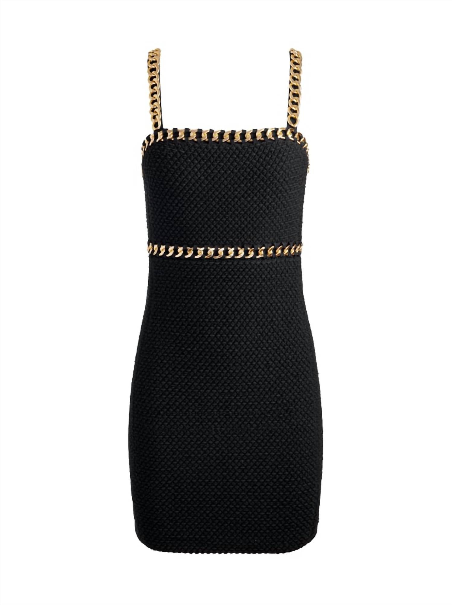 Embrace the sophisticated edge of the Black Kelly Chain-Trim Tweed Mini Dress by Alice + Olivia. This spaghetti strap dress crafted from a luxurious boucle tweed blend of 63% polyester and 37% acrylic features a flattering bodycon silhouette, accentuated with elegant gold chain trim detailing. Designed with a sleek above-the-knee length, it closes with a back zipper for a flawless fit. Imported and ideal for holiday parties, this dress requires dry cleaning to maintain its chic allure.