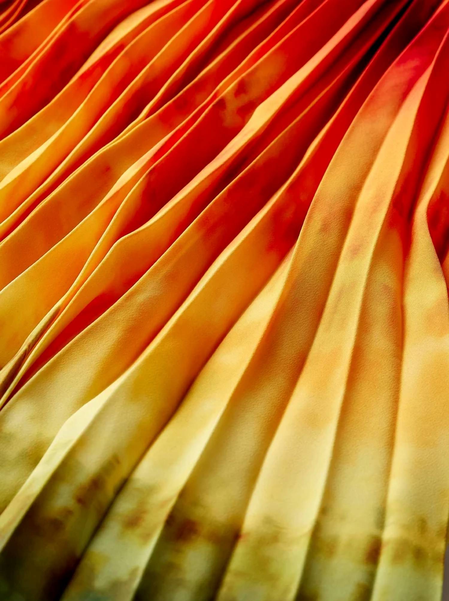 A maxi dress that is just as cute as it is comfortable. A piece that looks like a sunset in motion. This pleated tie dye maxi dress stuns in a bold print that fades from fiery red to golden yellow to deep ocean teal, like golden hour in fabric form. The plunging V-neckline and smocked back hug just right, while the flowy silhouette moves with every breeze. Finished with a hidden zipper for ease, it’s made for barefoot beach dinners, rooftop cocktails, and every photo op in between. Maxi dress Pleated Digitally printed tie-dye V-neck Smocked back with zipper closure Dry clean only