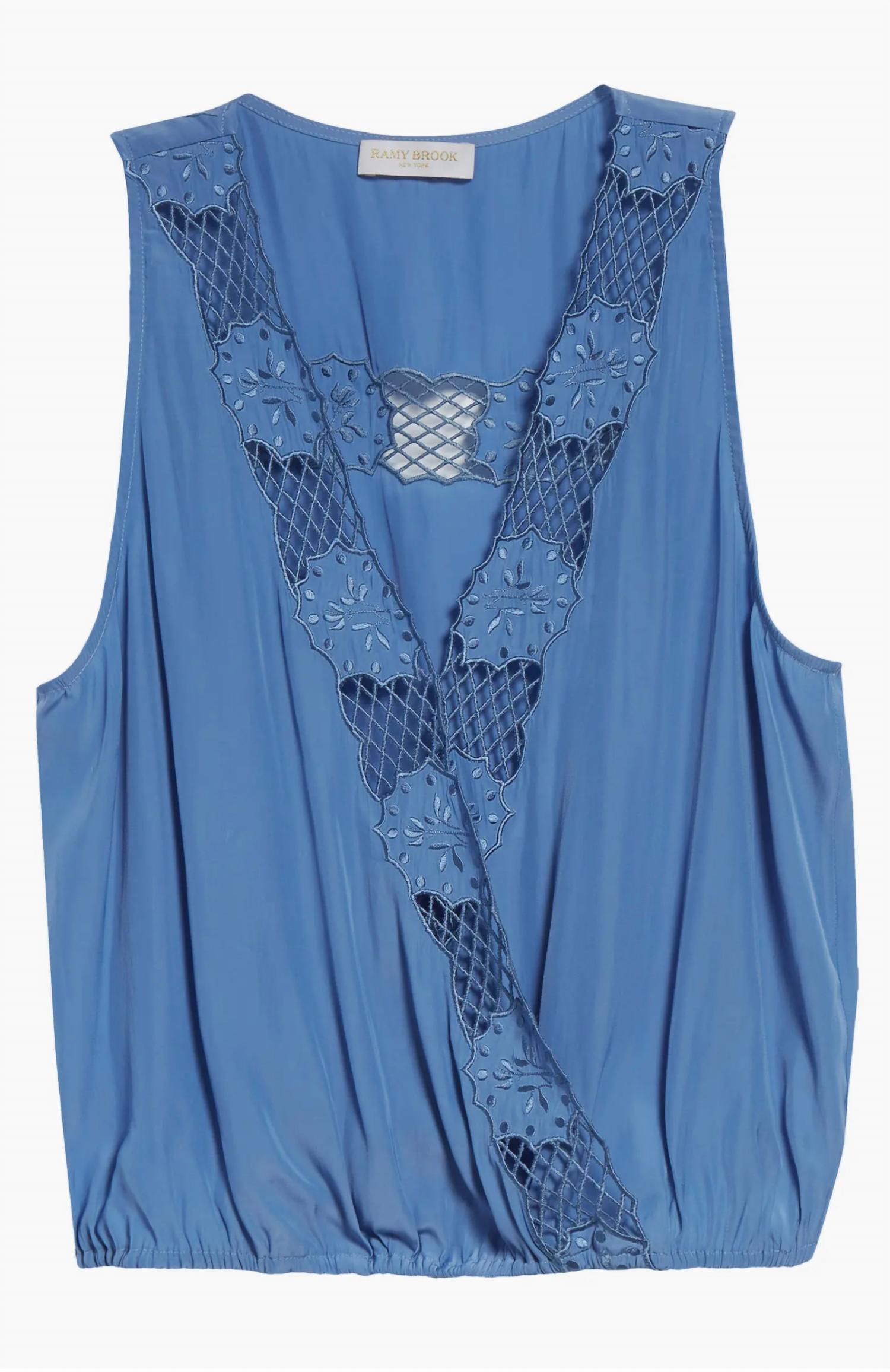 Fit, fabric and functionality. This tank top checks all the boxes. Meet the Daisy Embroidered Tank Top by Ramy Brook, a stunning choice in cornflower for summer celebrations. This sleeveless tank showcases a deep V-neckline with eye-catching contrast embroidery, perfect for beach days and rooftop parties. Made from 100% Polyester, it features an elastic-banded waist that creates a flattering cropped silhouette. Country of Origin: Not specified. Closure: Pull on. Care: Hand wash. Model Jasmine is 5'9" and wearing a size S.
