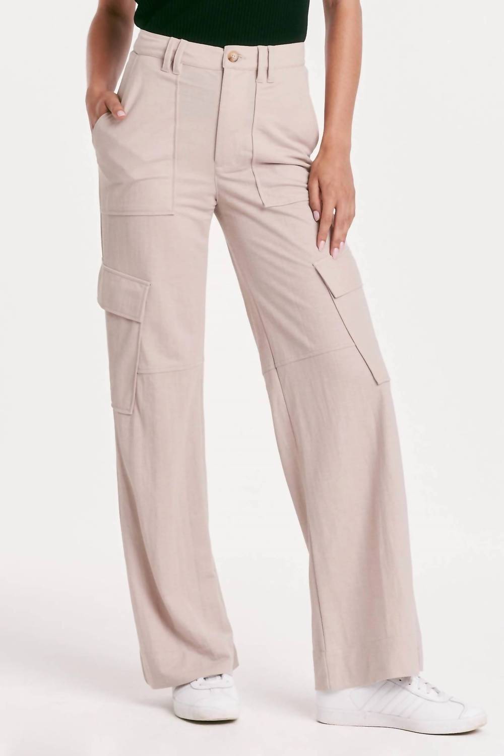 The Cairo Cargo Pants by Another Love in the color Moonshine are a stylish choice for both adventures and daily wear. Featuring a high rise with an 11" front rise and a 30" inseam, these wide-leg pants offer a 22" leg opening for a relaxed fit. Made from a nylon blend of 52% rayon and 48% nylon, they are imported with a solid pattern and convenient pockets. Closure is secured with a button, and they are easy to care for with machine wash cold and tumble dry low instructions.