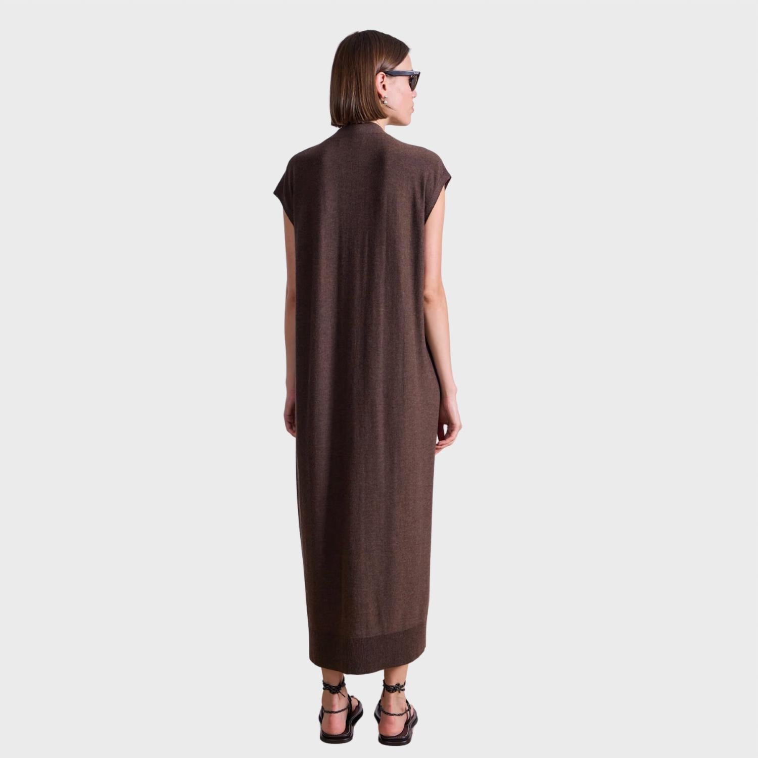 Presenting the Olana Knit Midi Dress by APIECE APART, a perfect wardrobe addition in a rich Espresso hue. This sleeveless, V-neck dress features a shift silhouette and midi length of 49 inches, offering an option to cinch the waist with an extra button loop for a casually elegant fit. Crafted from 55% Extrafine Merino and 45% Cotton, this lightweight piece effortlessly transitions through seasons. Button closure. Dry clean only. The model, standing at 5'10", is wearing a size small.