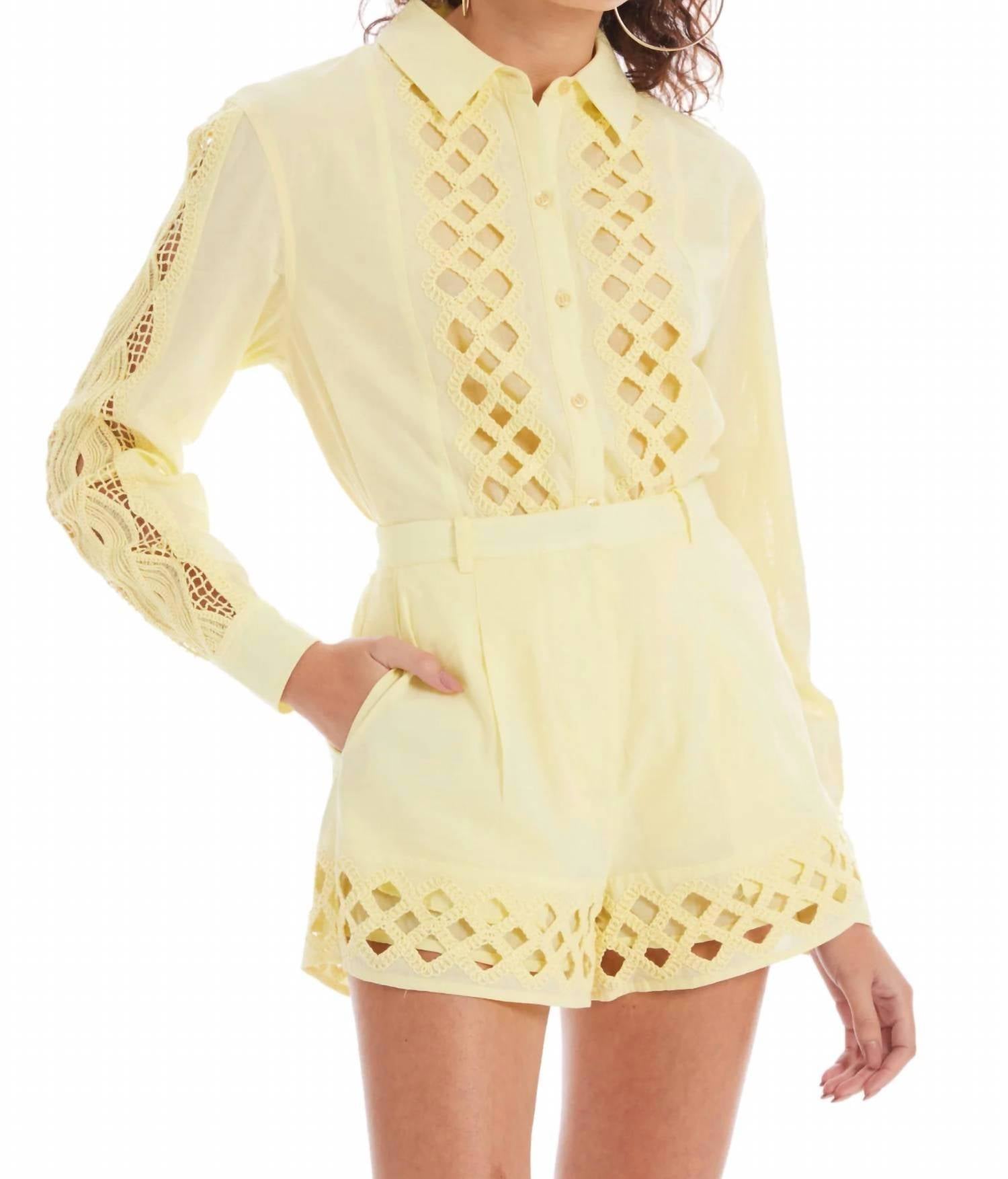 Discover the Camila Shorts by ALLISON NEW YORK, a perfect blend of playful charm and polished style in a sunny Butter hue. These high-waisted shorts feature a tailored fit with embroidered cutouts along the hem, adding a breezy vibe ideal for summer. With a fixed waistband and elastic back panel for comfort, these shorts also offer convenient side pockets. Composition: Self and lining both 100% Cotton. Closure: Pull-on style. Care: Dry clean only. Length: 12.75 inches, Inseam: 2.75 inches; Waist: 30 inches. Model is 5'9" and wearing a size small.