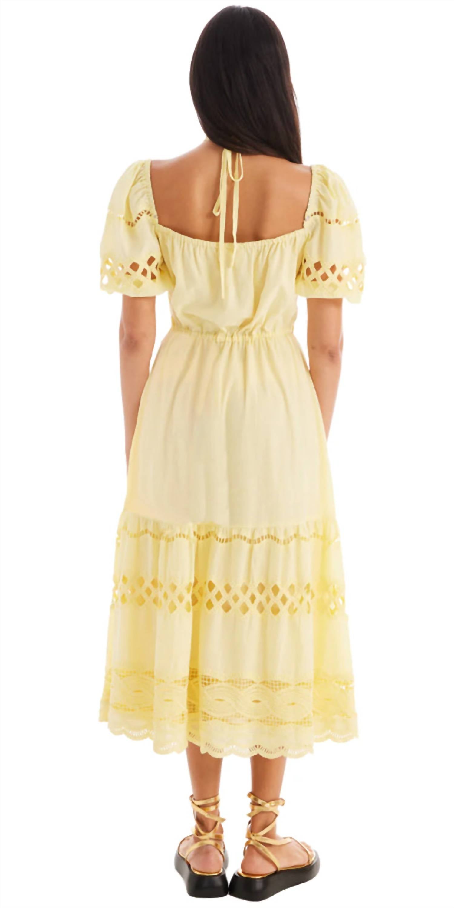 A midi dress so versatile, your options for wearing it are endless. Embrace the season with the Allison Emilia Midi Dress by ALLISON NEW YORK, a perfect choice for vacation chic. This butter-hued dress features short sleeves and a flattering A-line silhouette, crafted entirely from soft, lightweight cotton with intricate embroidered eyelet details. Designed for comfort, the dress includes elastic shoulder details and an adjustable drawstring at the waist, accentuating your figure in all the right places. Made from 100% cotton, it is recommended for dry clean only to maintain its pristine condition.