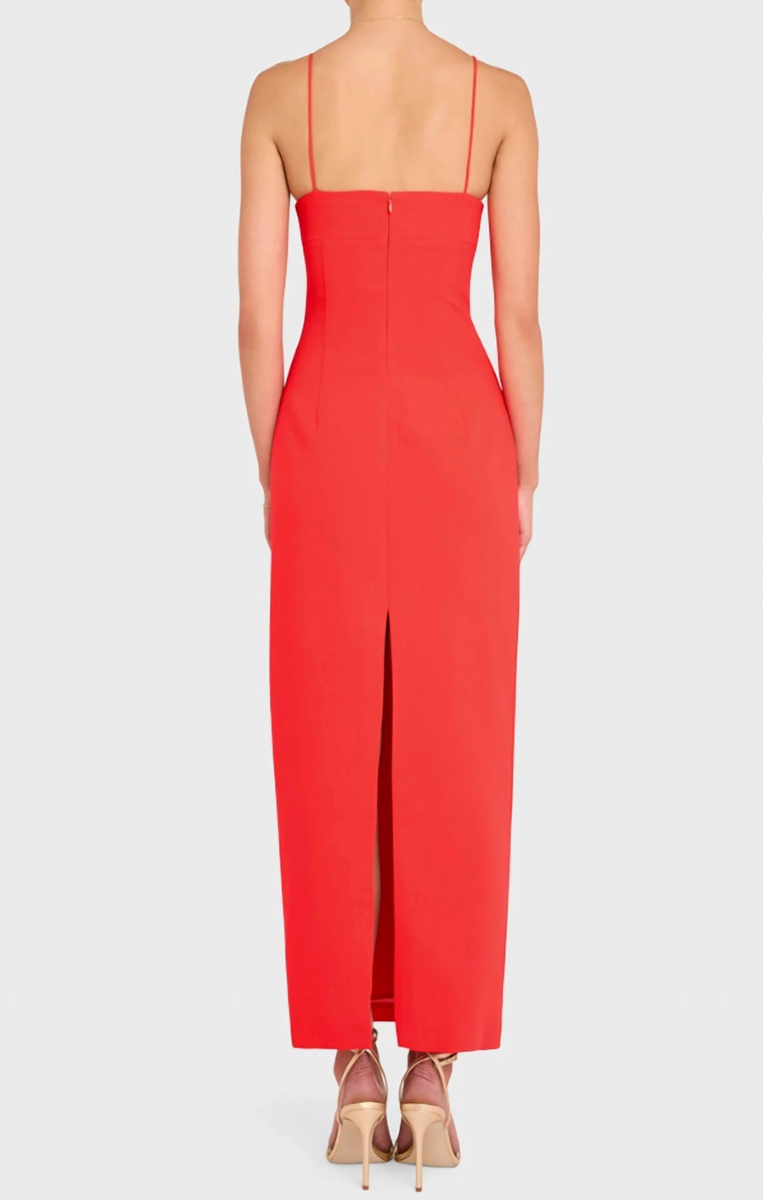 Who doesn't love a good maxi dress? This one you'll be reaching for season after season. Presenting the Lawrence Maxi Dress by Amanda Uprichard, an elegant choice for any formal event or special celebration. This crimson red sheath dress features delicate spaghetti straps and a timeless sweetheart neckline. Made from 100% polyester, it is designed with a structured fitted bodice and a slit at the center back for added detail. Closure is an invisible zip at the back, offering a seamless finish. This dress is perfect for formal events, romantic dinners, or special celebrations.