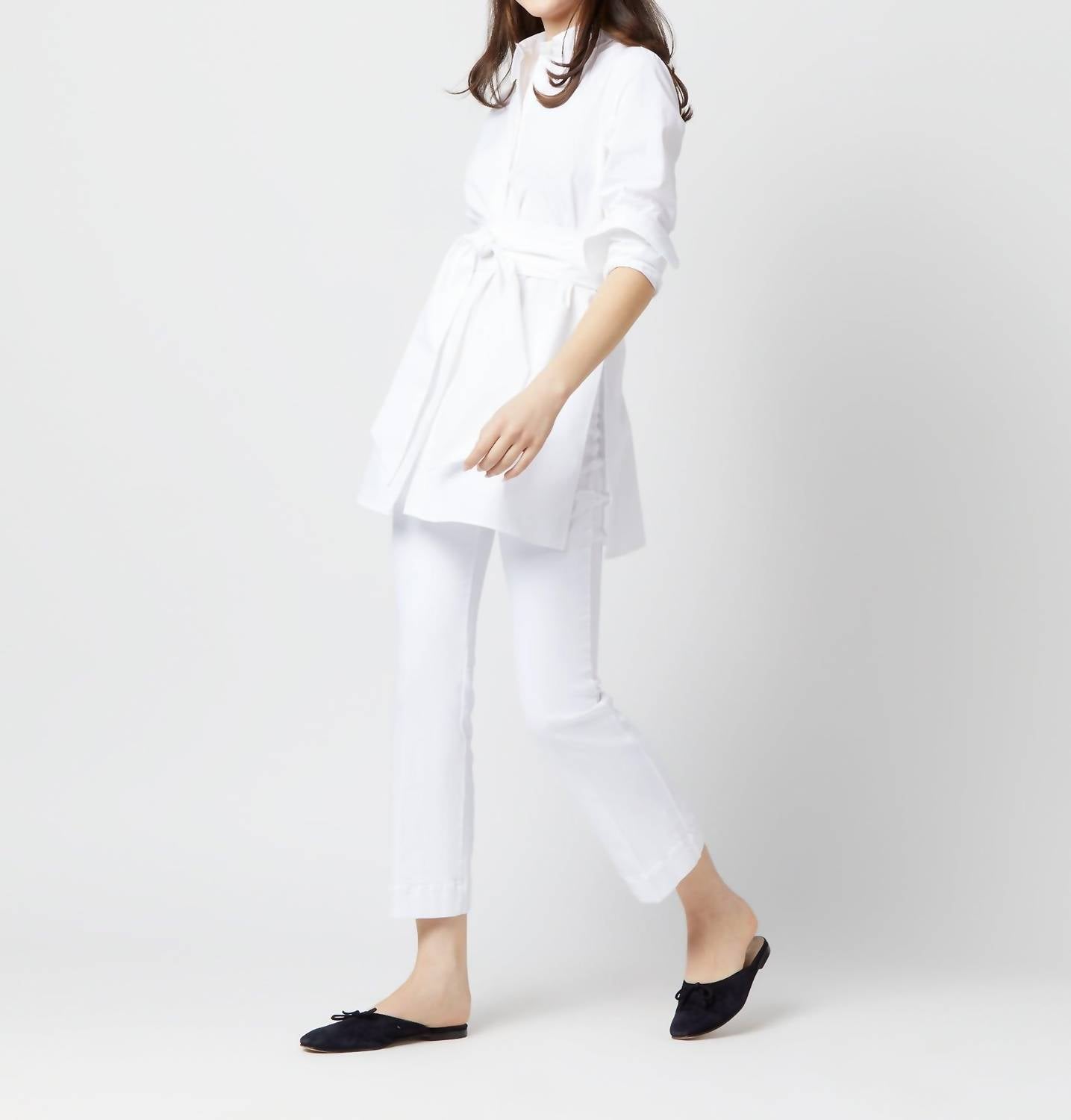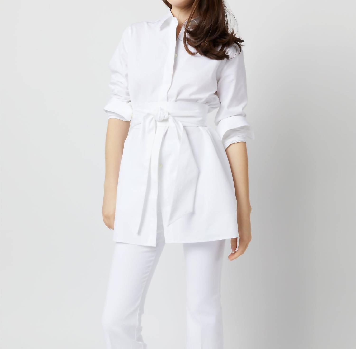 Discover the versatile charm of this tunic blouse, designed with both layering and standalone wear in mind. Its flattering silhouette and stylish details make it a closet essential. Introducing the Gabrielle Tie Tunic by Ann Mashburn, an elegant workwear piece in crisp white poplin. Crafted from 100% Italian cotton, this long sleeve tunic features a chic collar and button closure. Its optional waist sash allows for versatile styling, whether knotted at the front, tied in a bow at the back, or left to drape freely. Made in Honduras, the tunic includes curved side slits and a covered front placket, with care instructions of machine wash and hang dry, along with medium iron to maintain its refined look.