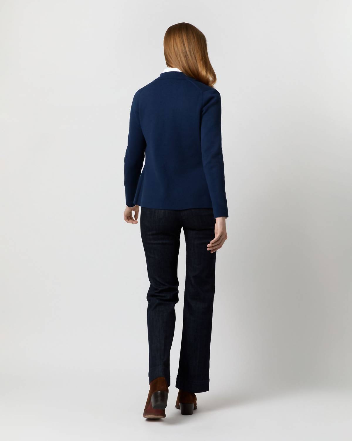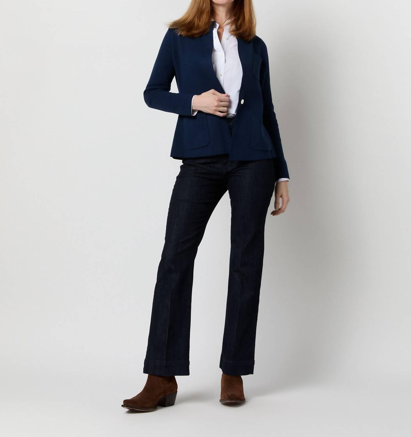 A jacket so versatile you can literally wear it with anything. Introducing the Schoolboy Jacket by Ann Mashburn, a stylish blend of comfort and elegance perfect for travel. This long sleeve casual jacket, crafted from a luxurious textured cotton blend, features mother-of-pearl buttons and cozy patch pockets at the chest and hip. Originating from China, it is a polished choice for fall workwear in a chic navy cotton/silk mix. To maintain its quality, hand wash it cold and lay flat to dry.