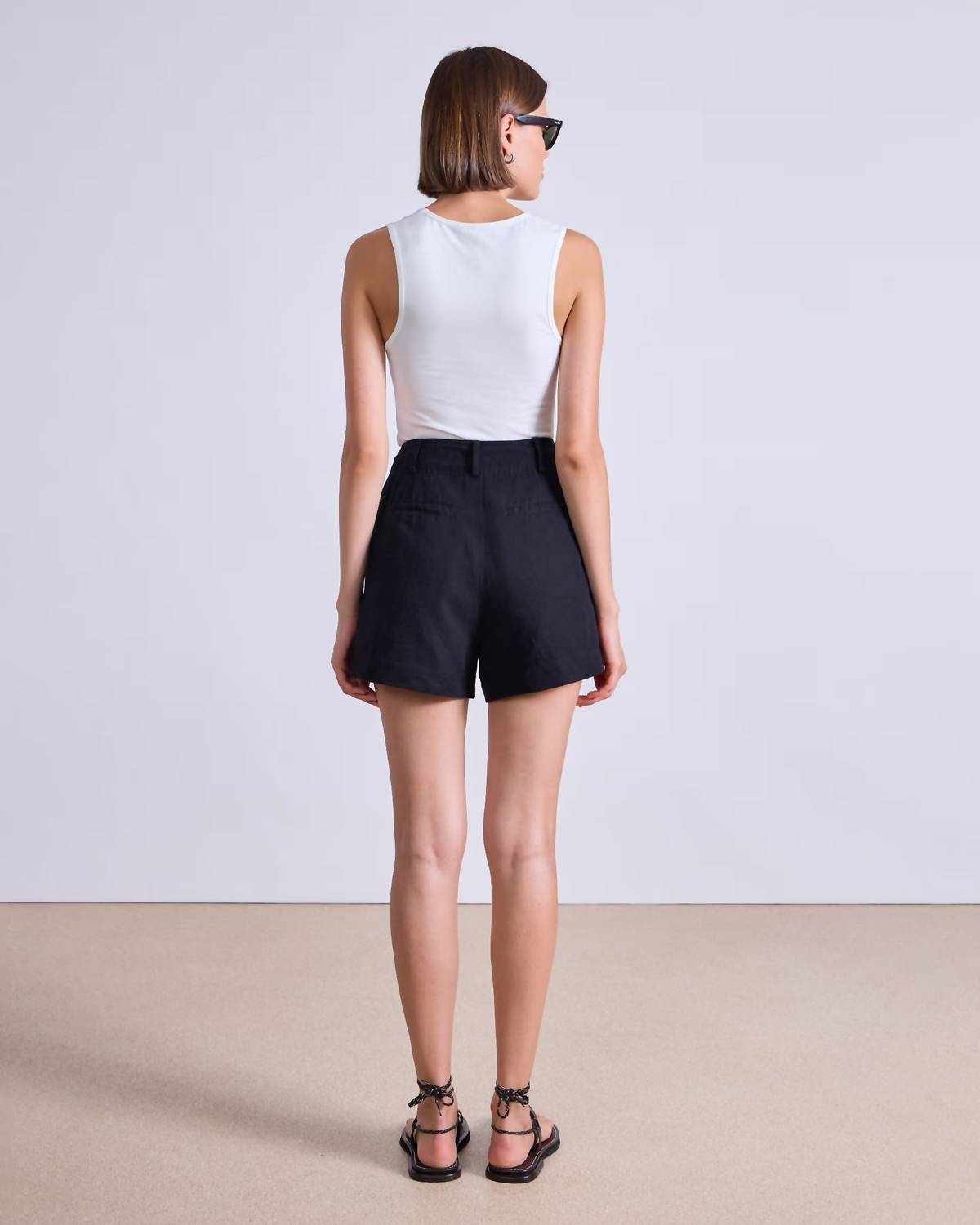 Tuck your favorite tee into these high-waist shorts for a more casual-cool feel. Meet the Bari High Waist Short by APIECE APART, an embodiment of quiet luxury perfect for spring vacations. Designed with a flattering fitted silhouette, these shorts are crafted from a soft blend of 60% linen and 40% organic cotton, offering comfort and style. Made in China, they feature a pull-on closure and have practical pockets. The black, solid high-waist piece has a front rise of 11 1/4" and an inseam of 3 1/4", with a recommendation to size up.