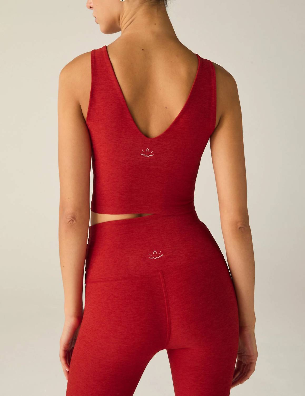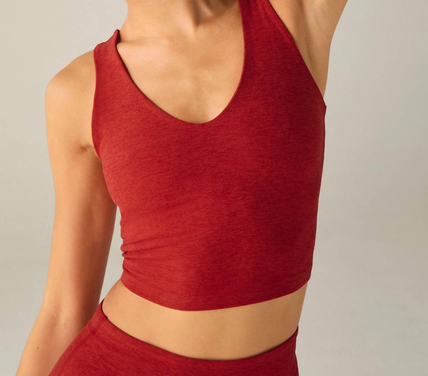 Pair this crop top with your favorite high-waisted jeans or maxi skirt. Discover the Spacedye Good Day Crop Tank by BEYOND YOGA, an essential piece in vibrant Ruby Red for versatile summer wear. This sleeveless crop top boasts a front and back V-neckline with a medium support self shelf bra, made from the signature softness of Spacedye polyester material. Crafted in the US, its flattering design ensures comfort whether paired with leggings or jeans.